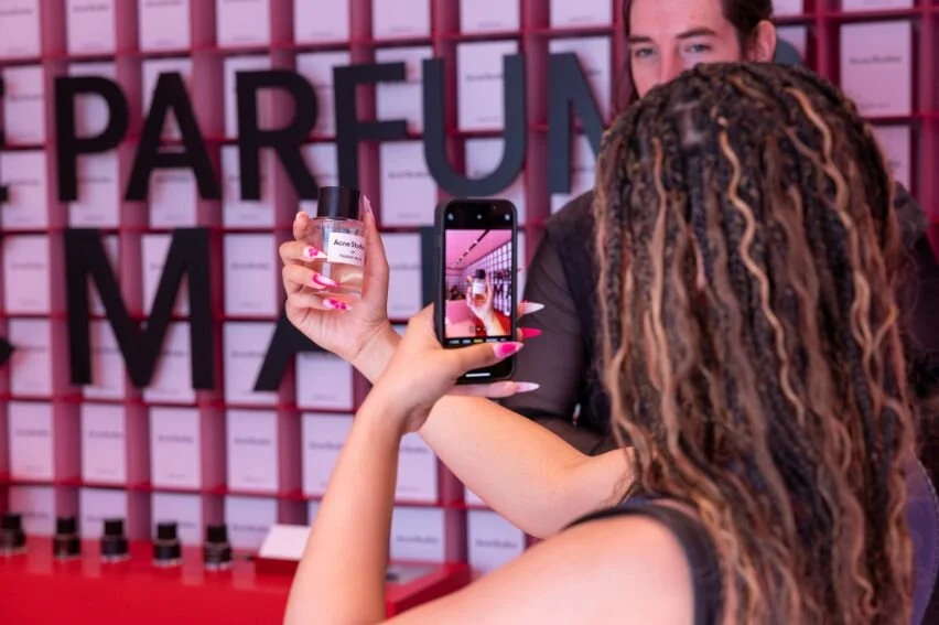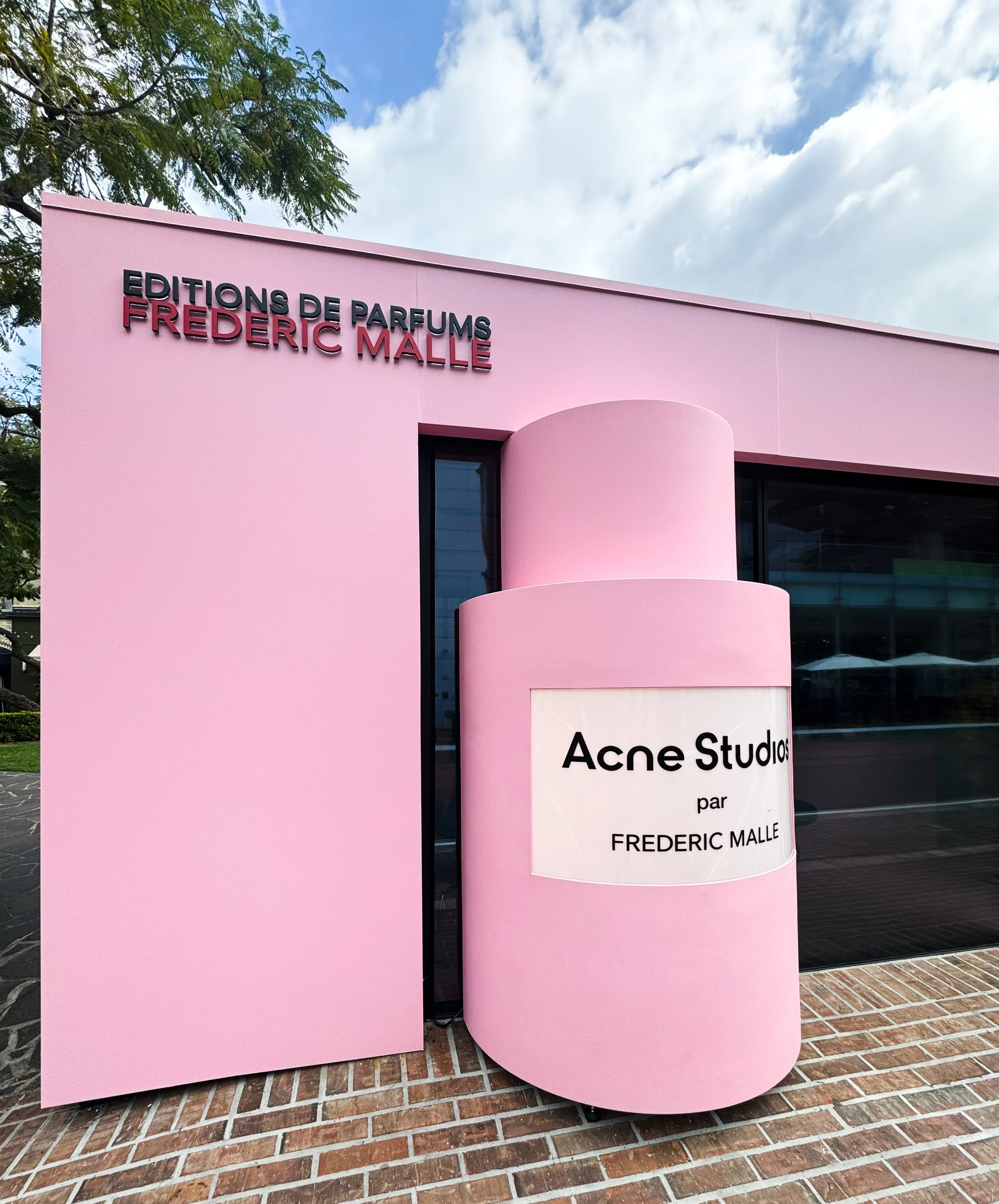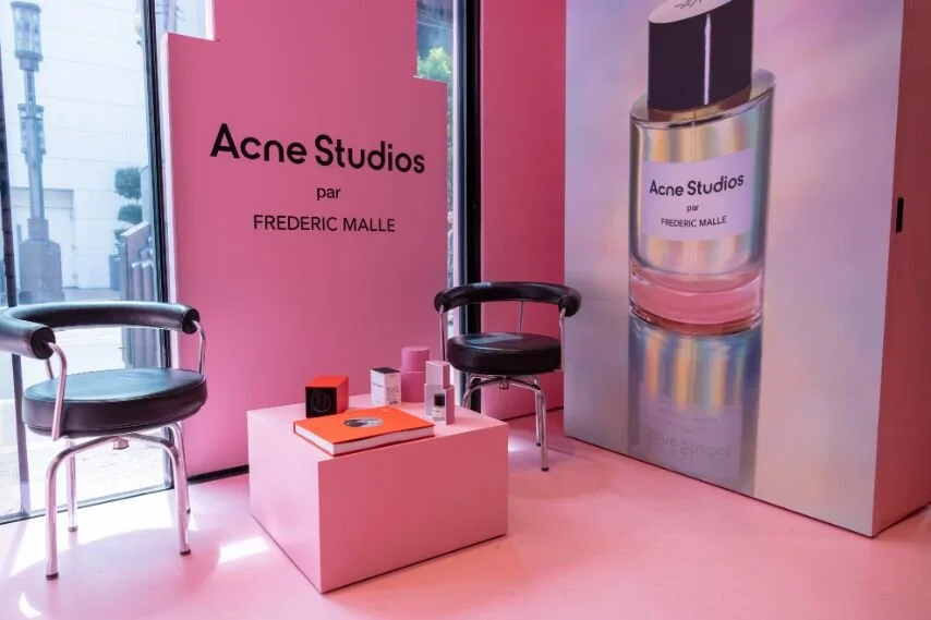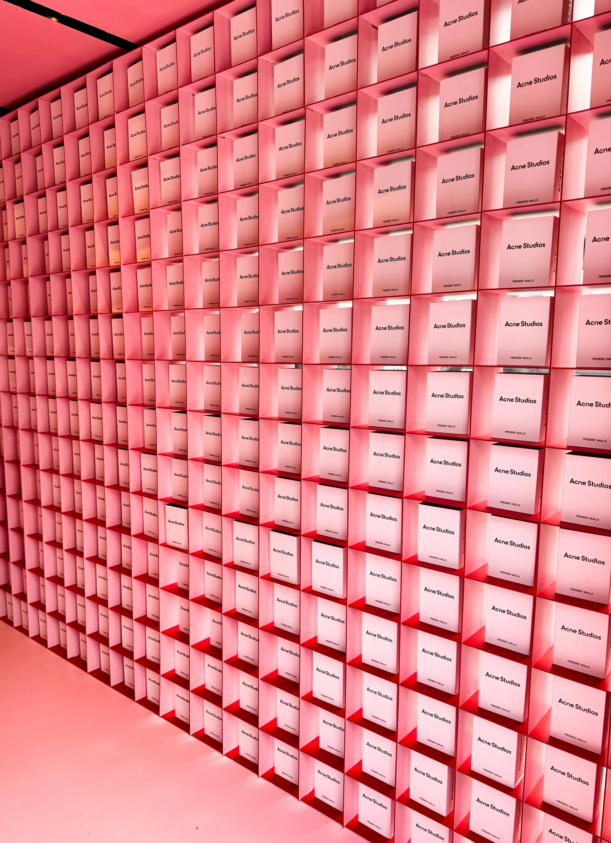 Acne Studios pop-up shop fabrication at The Grove Los Angeles. Hard coated foam bottle prop with interior lightbox for backlit label. Temporary pink facade panels mounted via roof-supported exo-structure for signage, vinyl graphics, and door returns. Durable interior and exterior panels, CNC cut infinity shelves with optical red/pink effect, custom furniture with power and storage, and concealed-hardware 3D shelf-mounted signage.