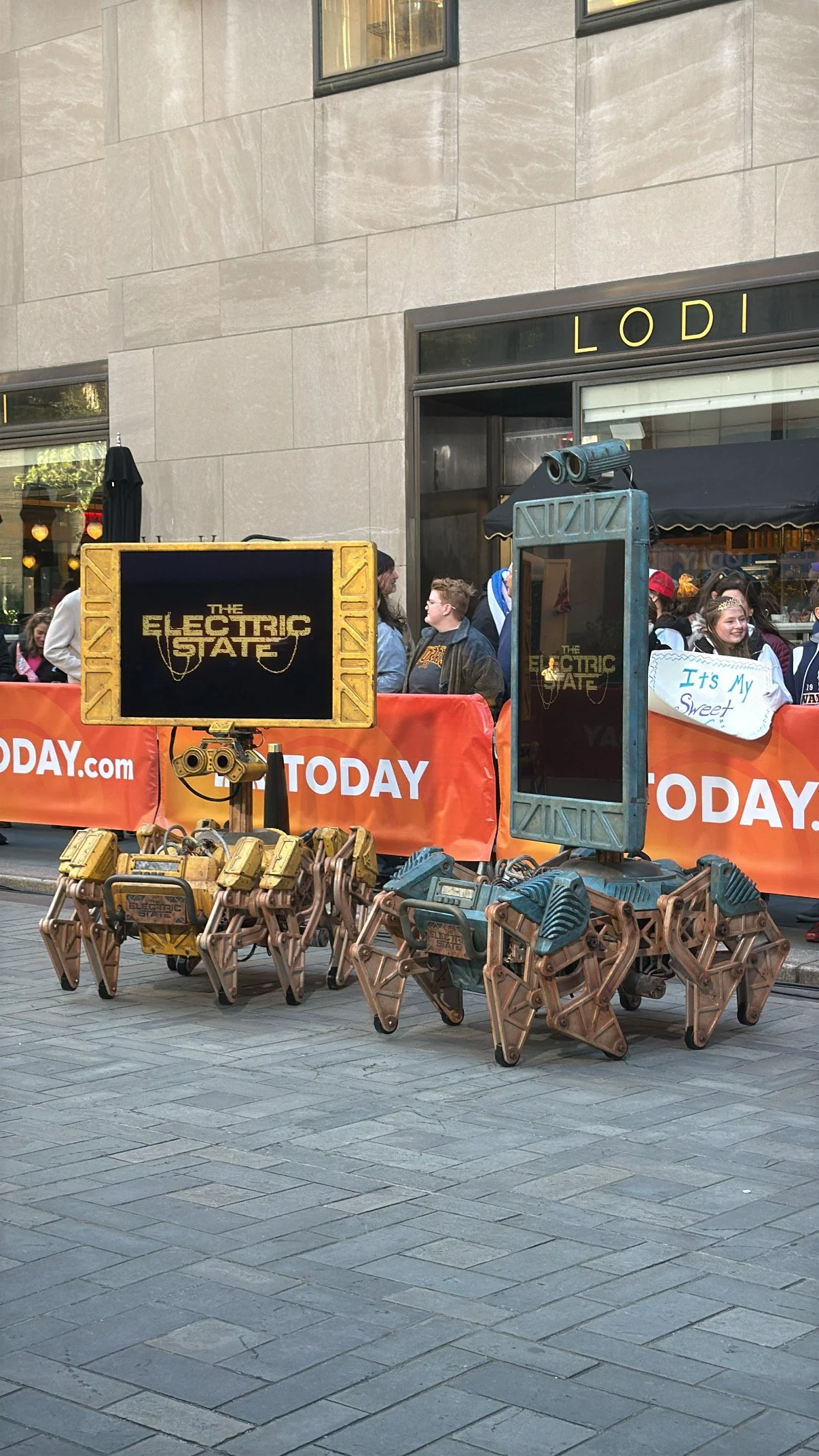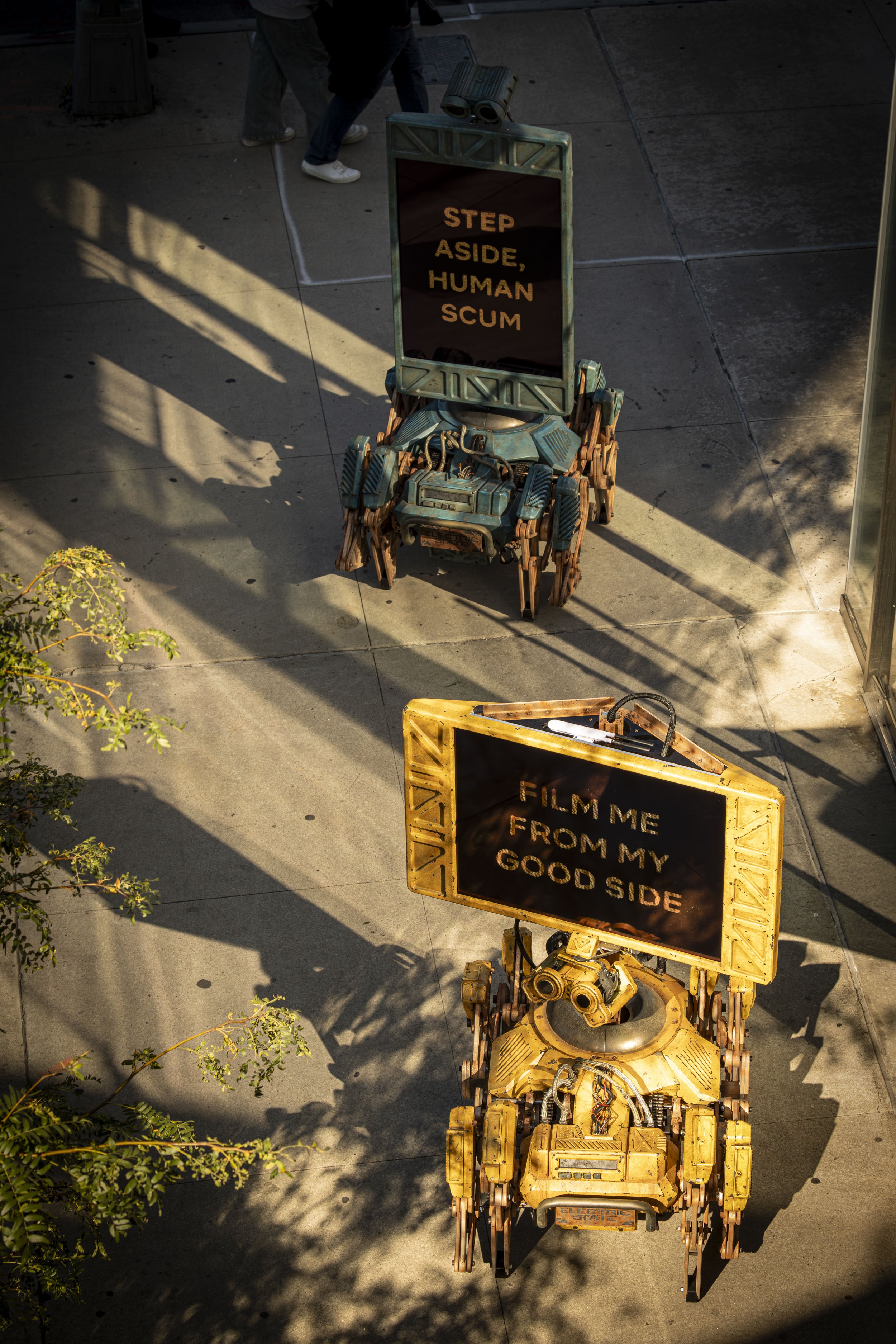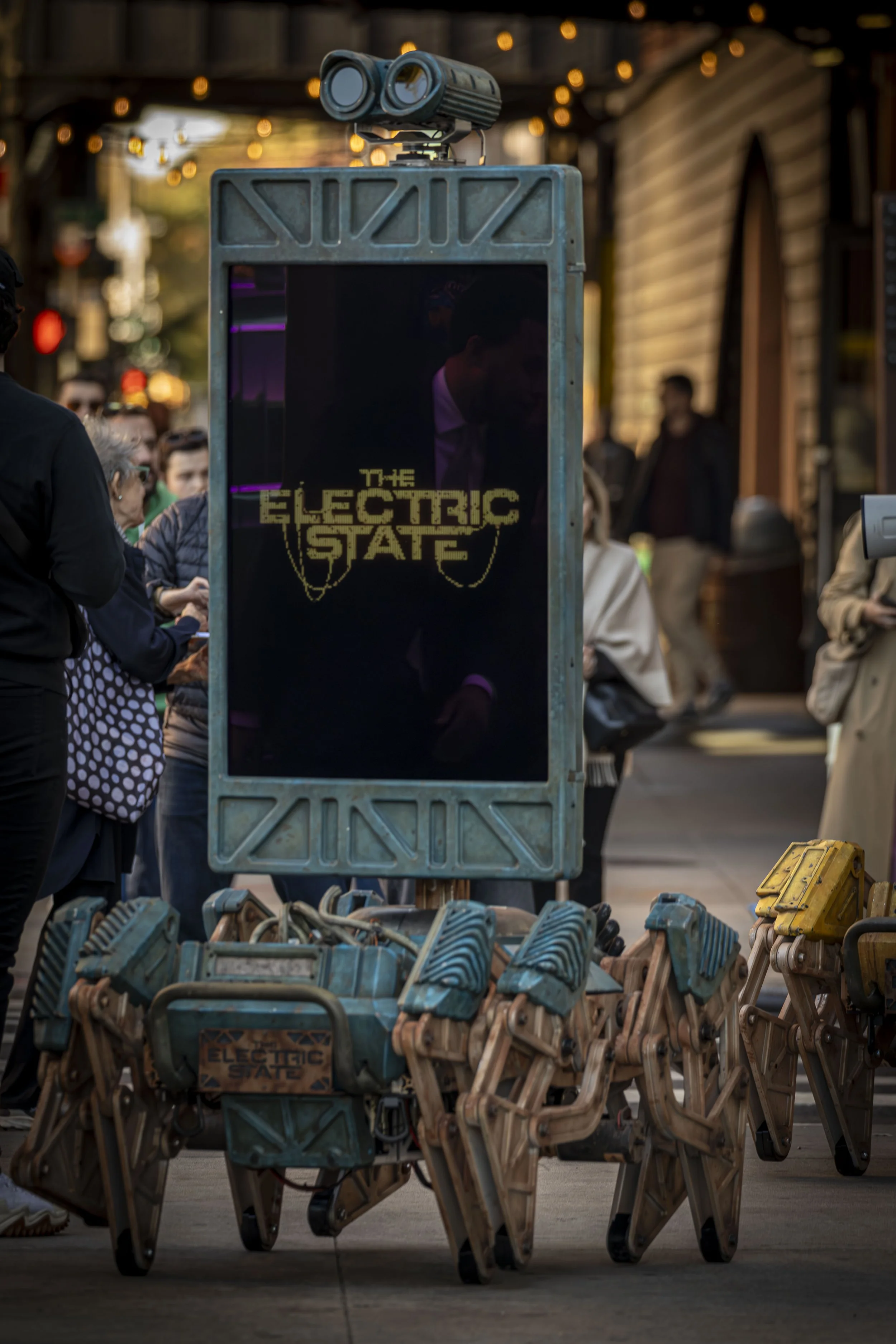 The Electric State BILLBOTS scenic fabrication with VTProDesign for global press tour events in New York, London, and Sydney. Nylon 3D printing and vacuum forming, extreme weathered paint patina, kit-bashed wiring harness and industrial tubing details, and durable interactive finishes for functional robotics.