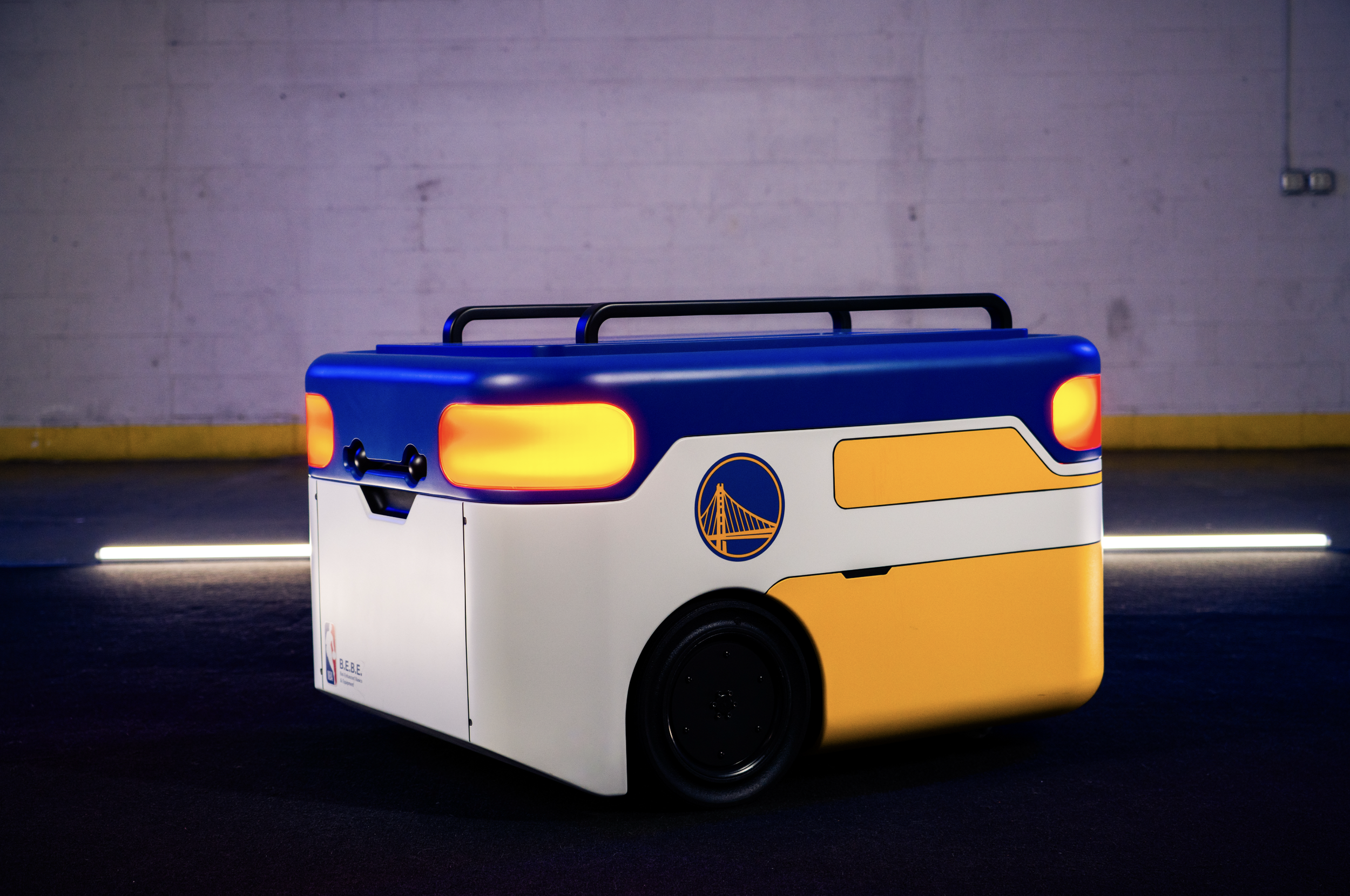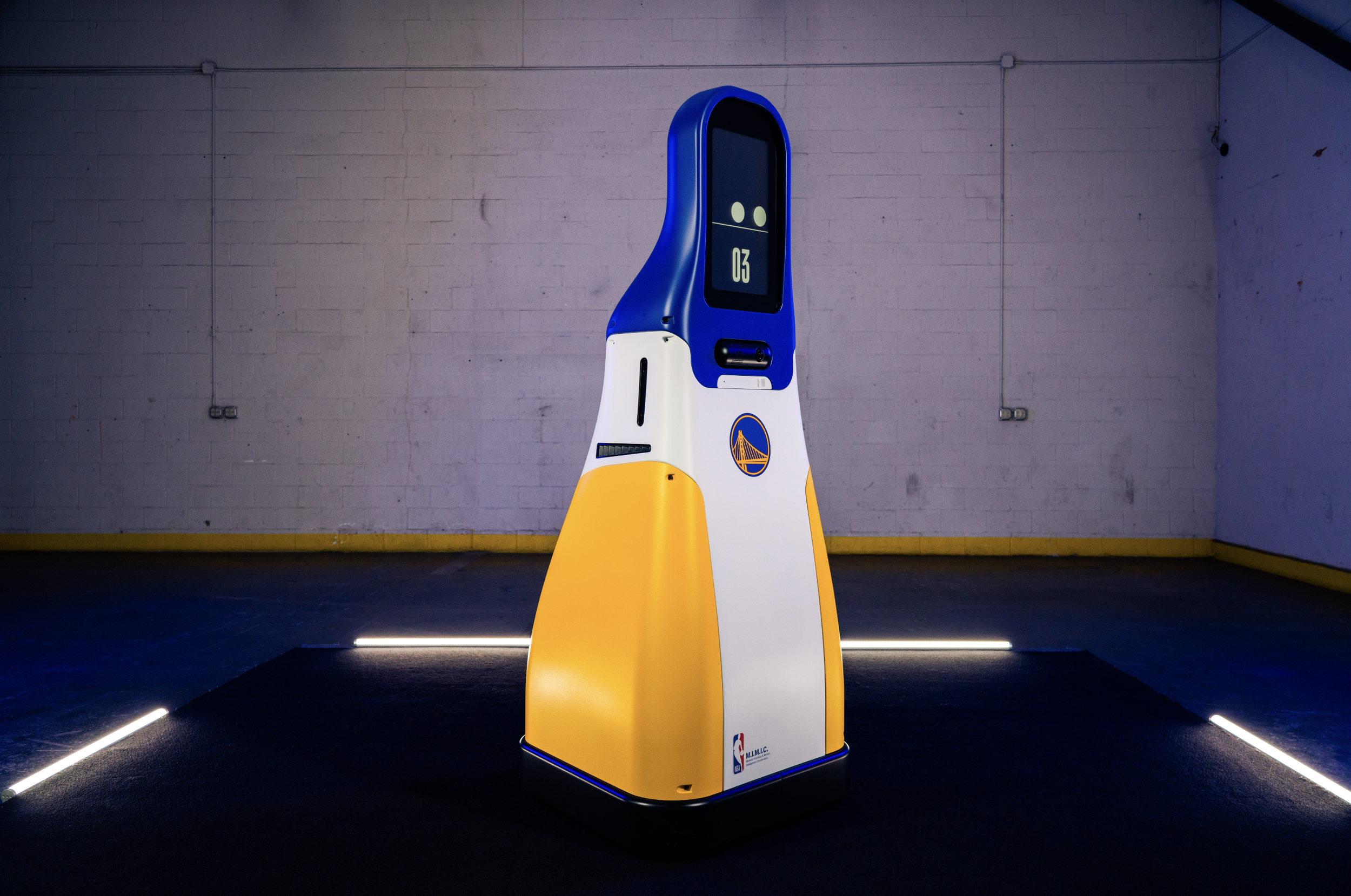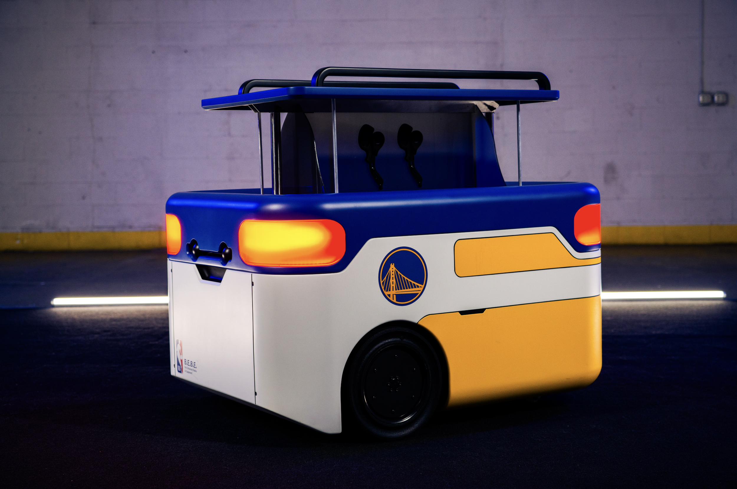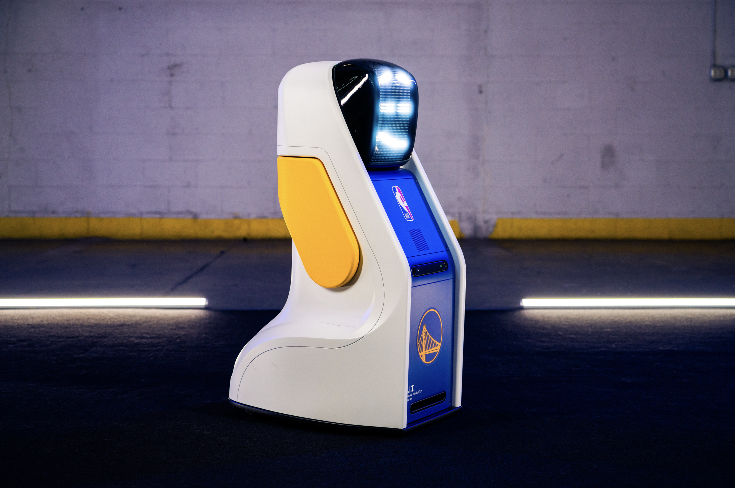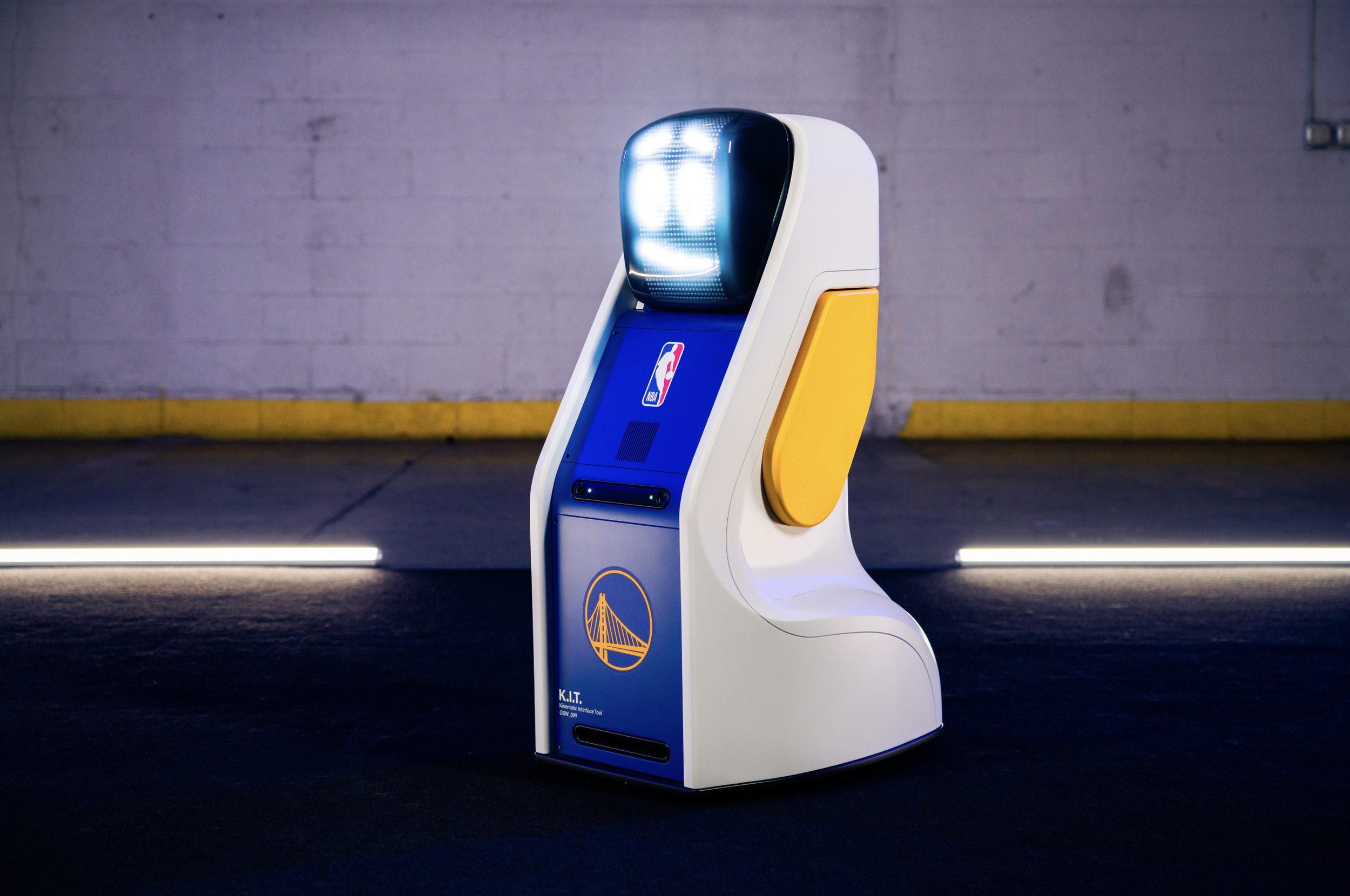 Golden State Warriors conference bots fabrication with VTProDesign. Scenic robot bodies for KIT, MIMIC, and BEBE using SLA and FDM 3D printing, body shop finishing, Pantone-matched automotive paint, clear lenses with tinting to diffuse LEDs, modular panels for maintenance, and tight tolerances for moving parts.