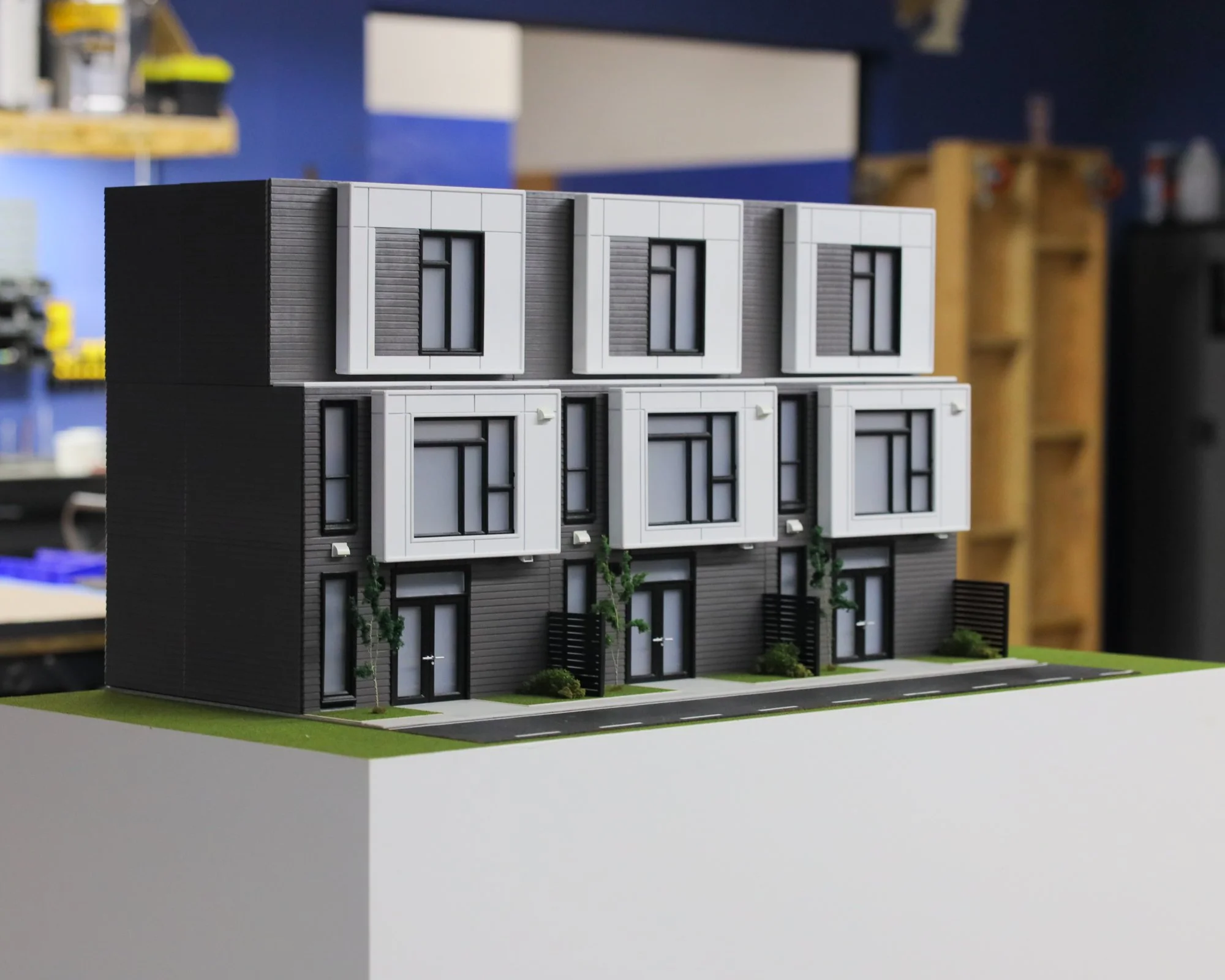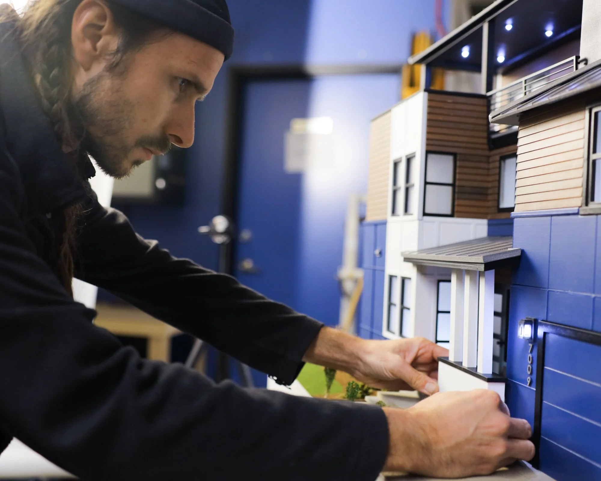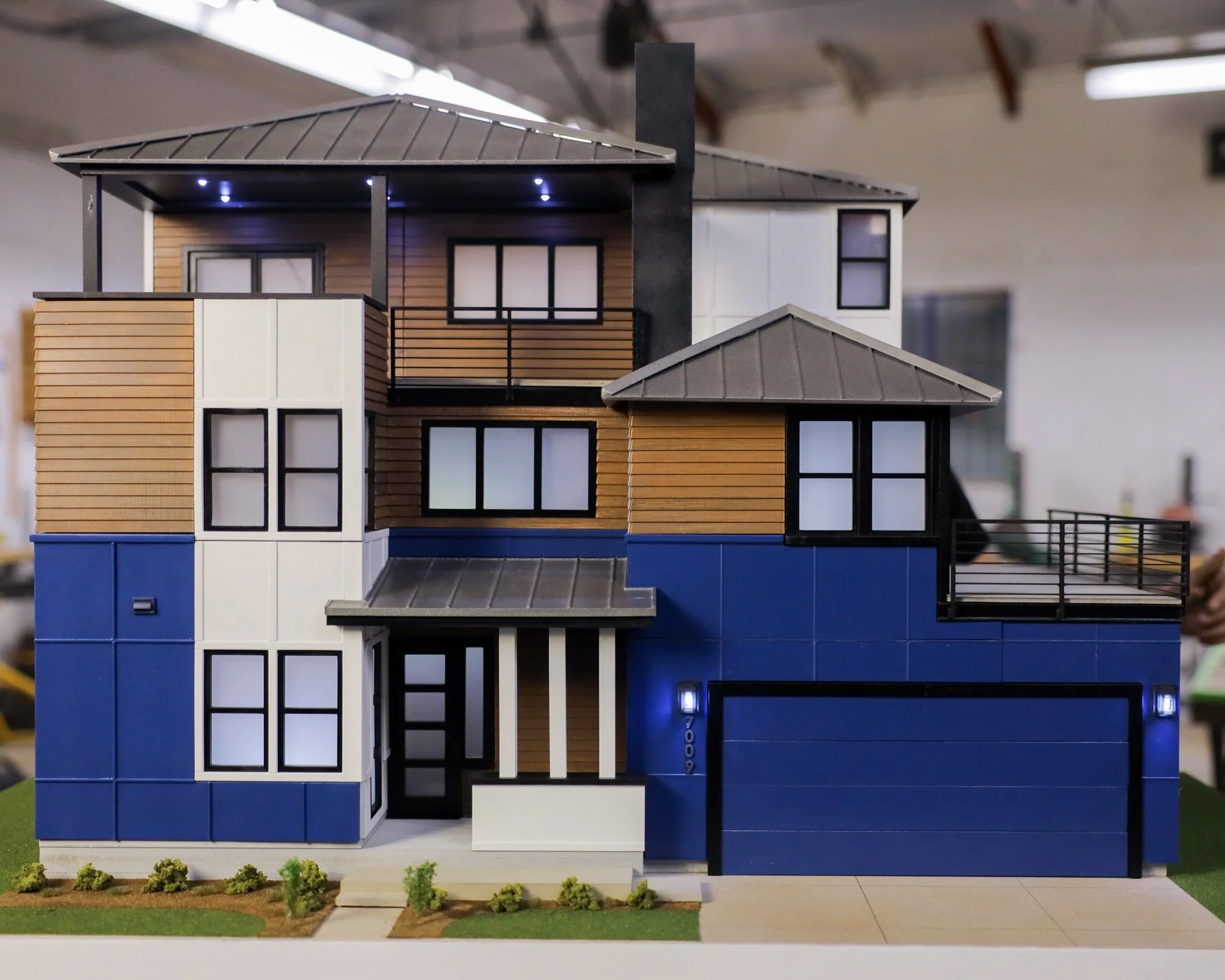 James Hardie miniature home models showcasing siding products. Magnetic swappable facade panels, 2x4 foot plinth displays with lighting and landscaping, 3D printed components with extensive body shop finishing, multiple scales for context, steel rod substructures, and permanent display at James Hardie HQ R&D division.