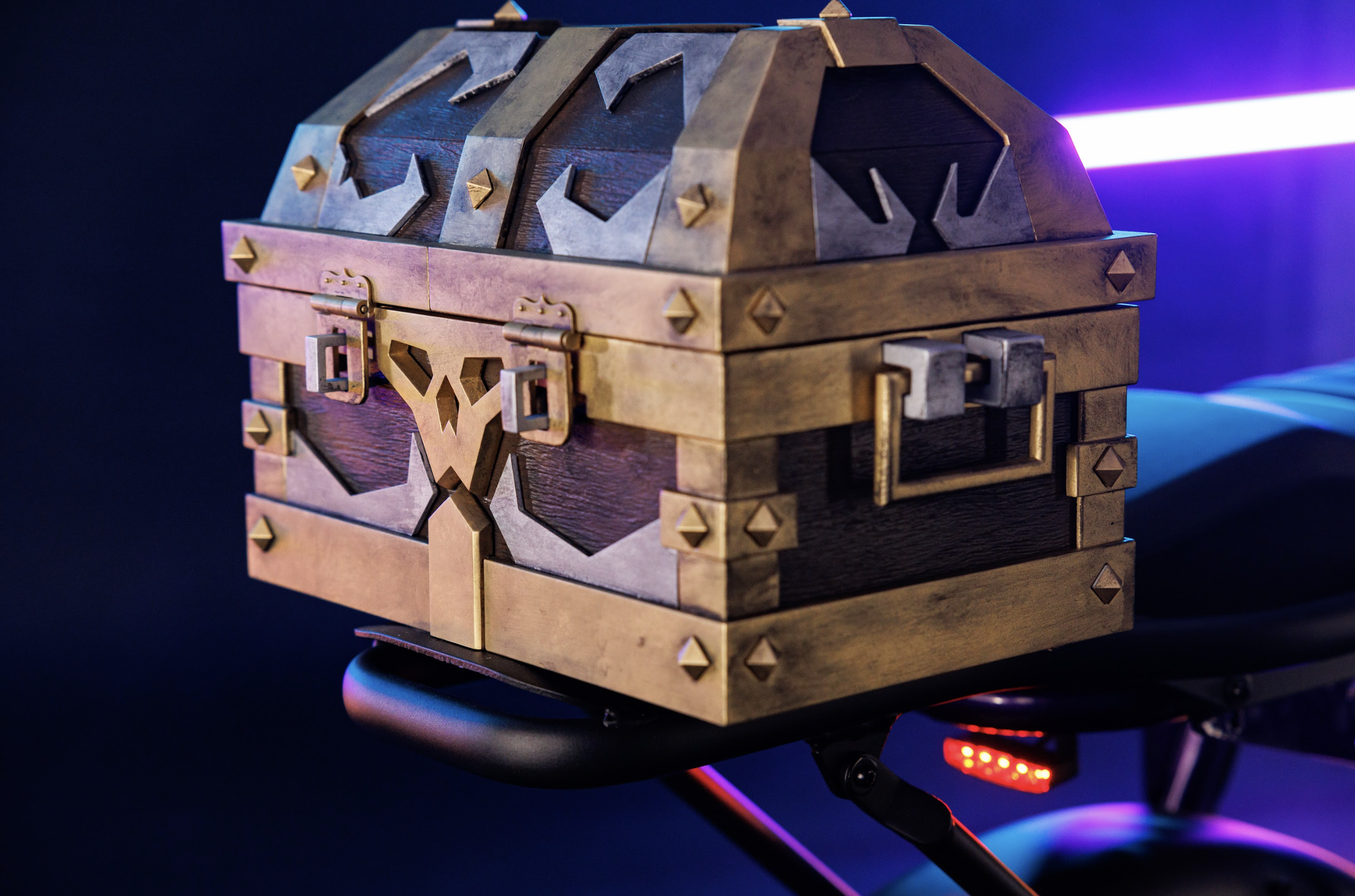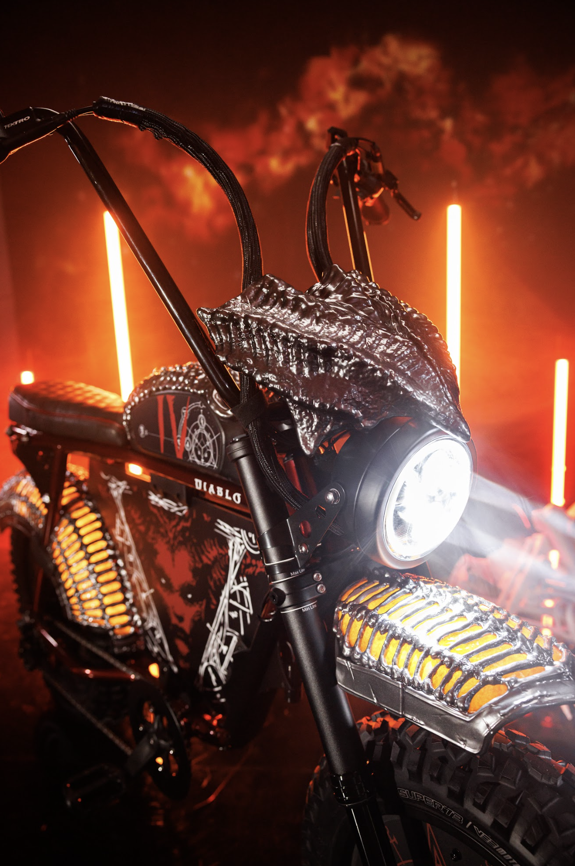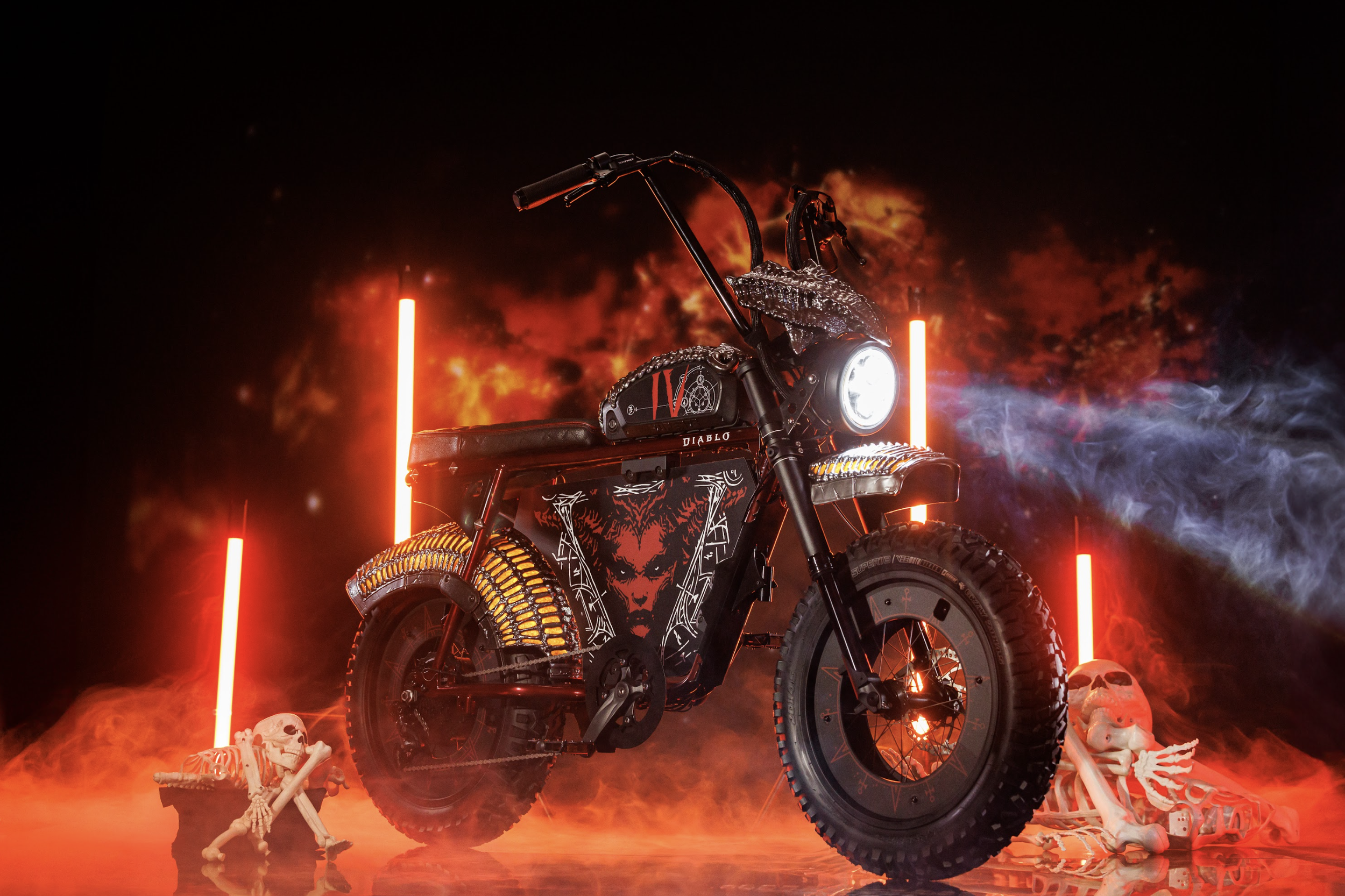 Super73 custom e-bikes for Xbox game themed prize giveaways: Halo, Diablo, DOOM, Forza, Sea of Thieves, and Starfield builds. Scenic paneling, SLA and FDM 3D printed parts, durable nylon, body shop finishing, automotive paint, custom lighting, animatronic visor headlamp reveal, metallic bone-like elements, chopper handlebars, rear cowls for graphics, functional storage treasure chest and NASA-inspired rear box with trellis frame and magnetic water bottle.