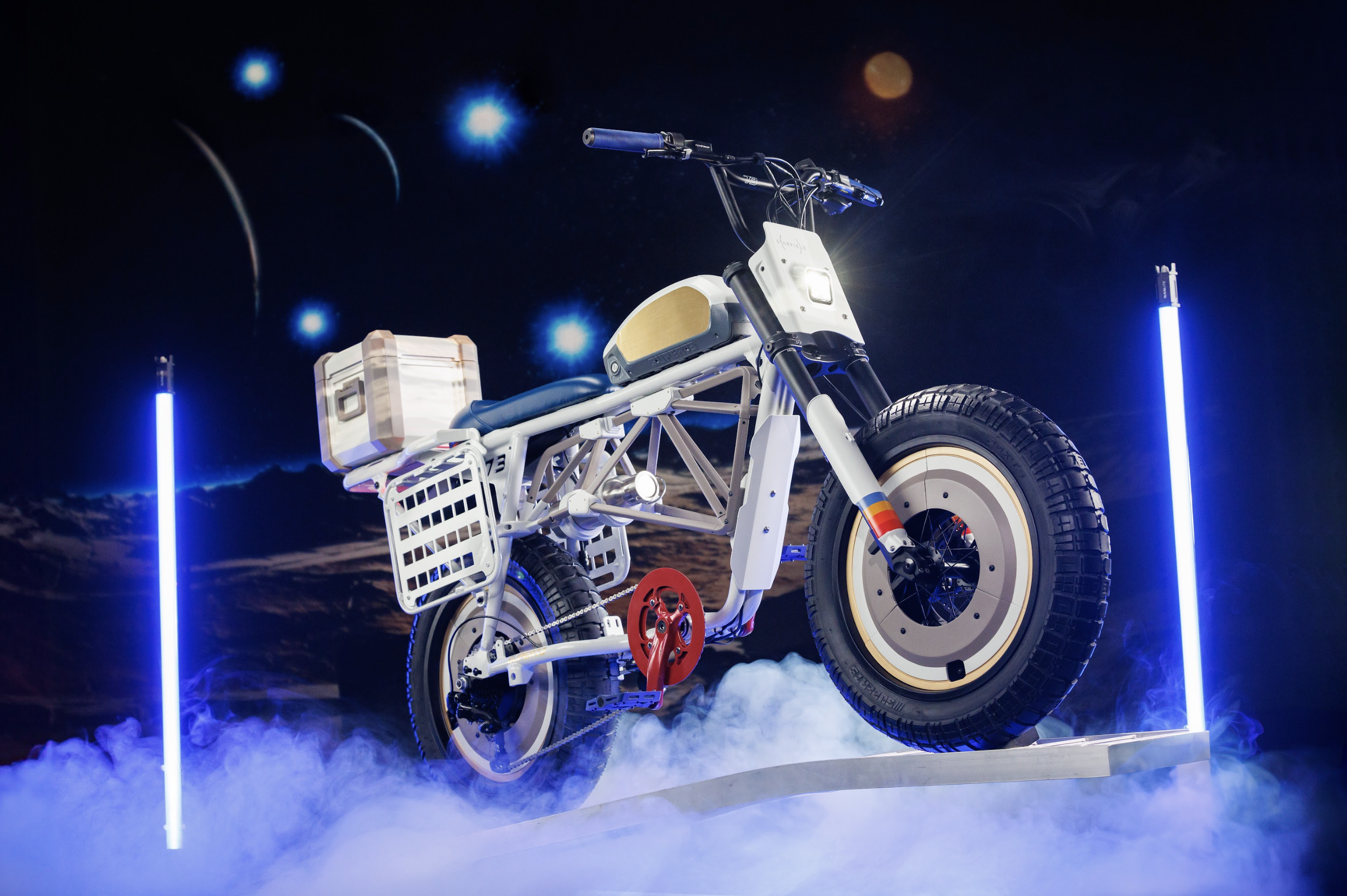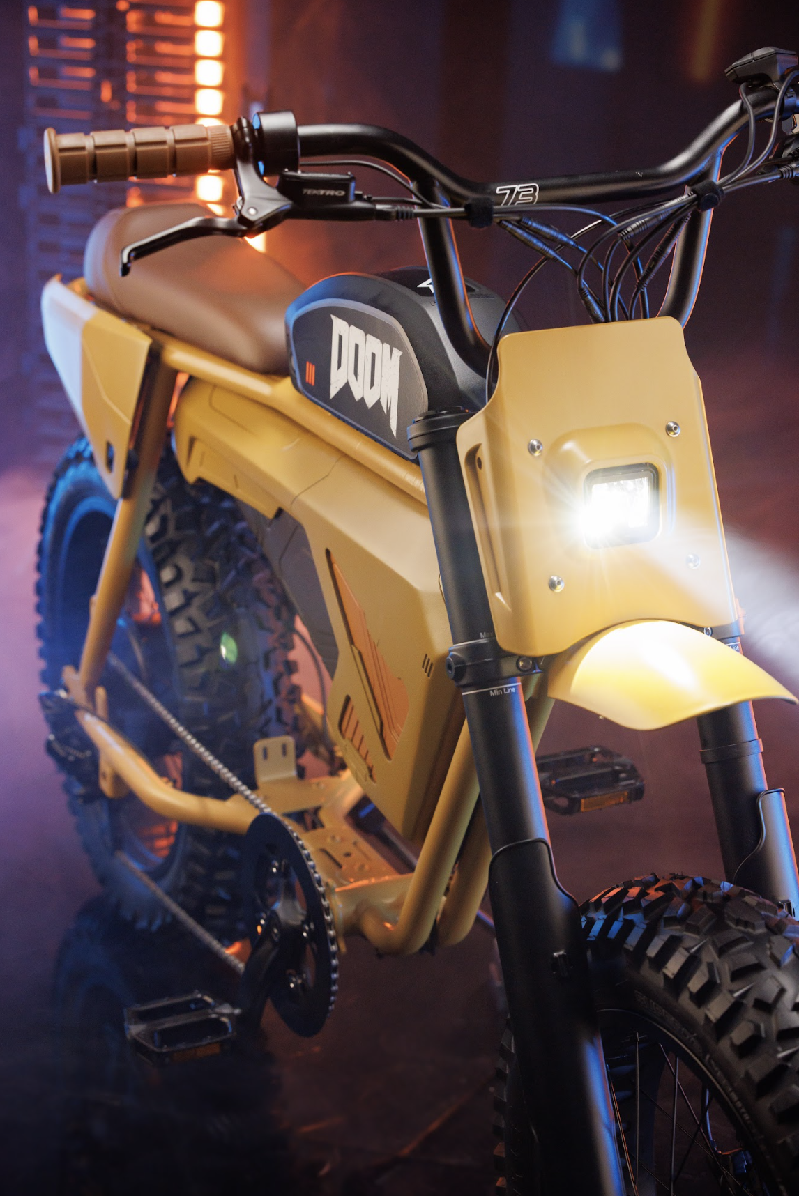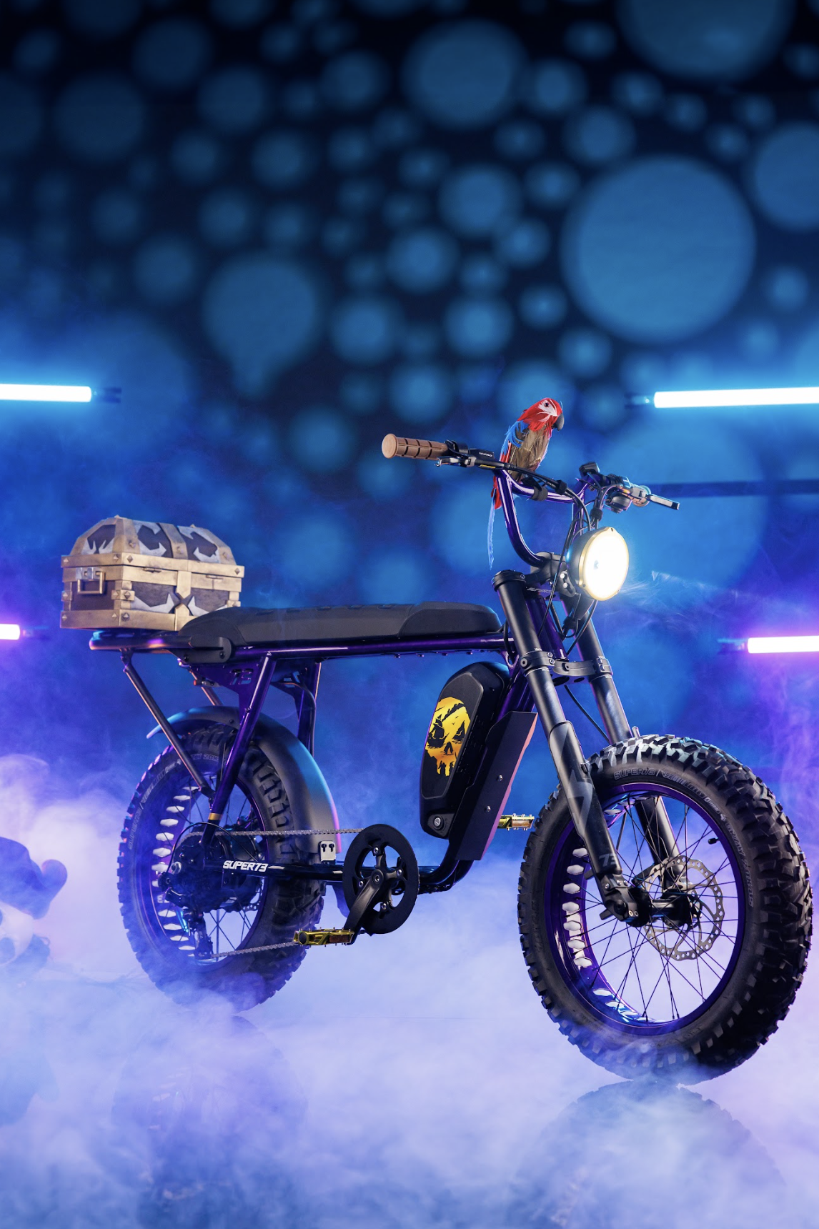 Super73 custom e-bikes for Xbox game themed prize giveaways: Halo, Diablo, DOOM, Forza, Sea of Thieves, and Starfield builds. Scenic paneling, SLA and FDM 3D printed parts, durable nylon, body shop finishing, automotive paint, custom lighting, animatronic visor headlamp reveal, metallic bone-like elements, chopper handlebars, rear cowls for graphics, functional storage treasure chest and NASA-inspired rear box with trellis frame and magnetic water bottle.