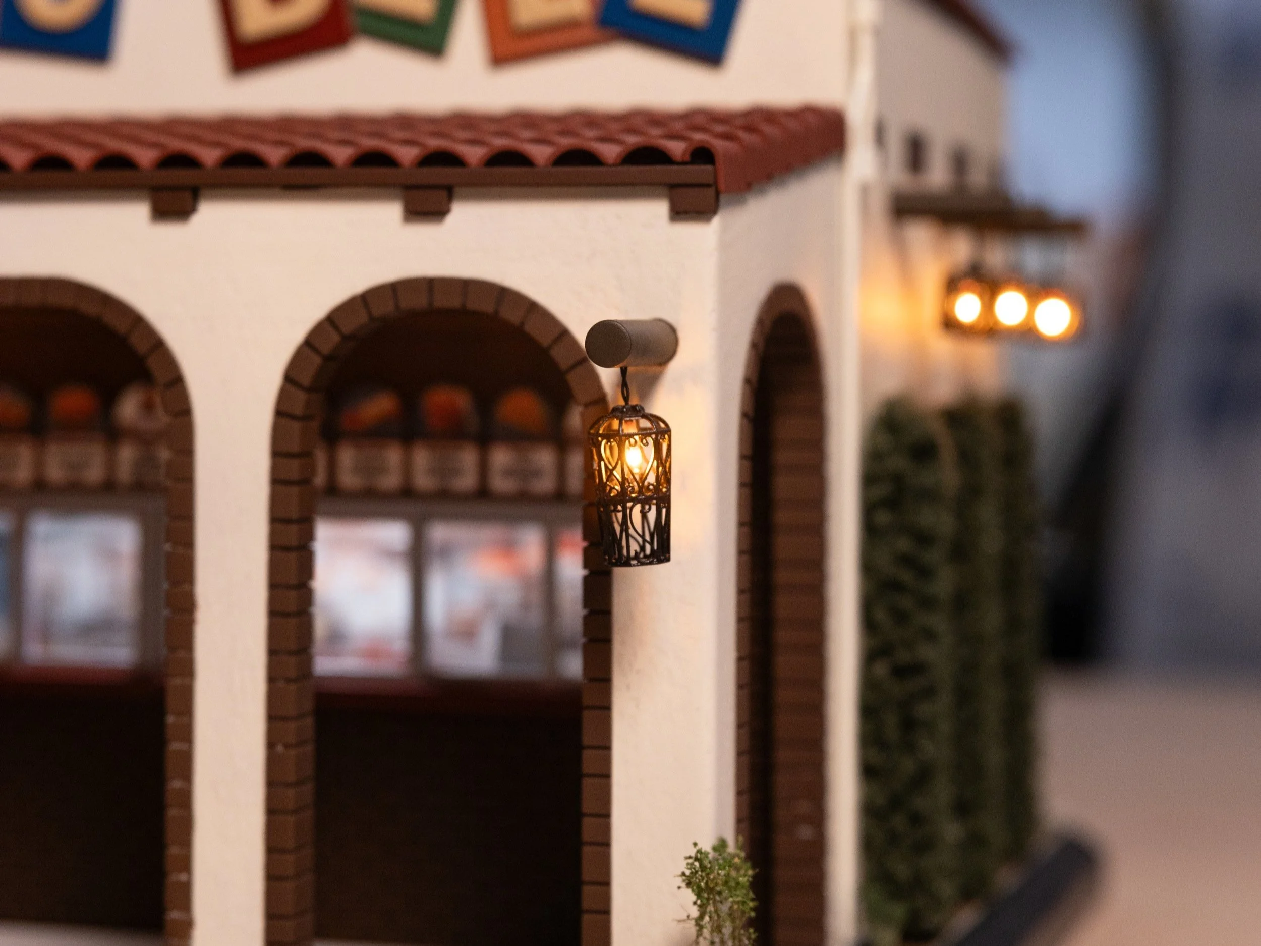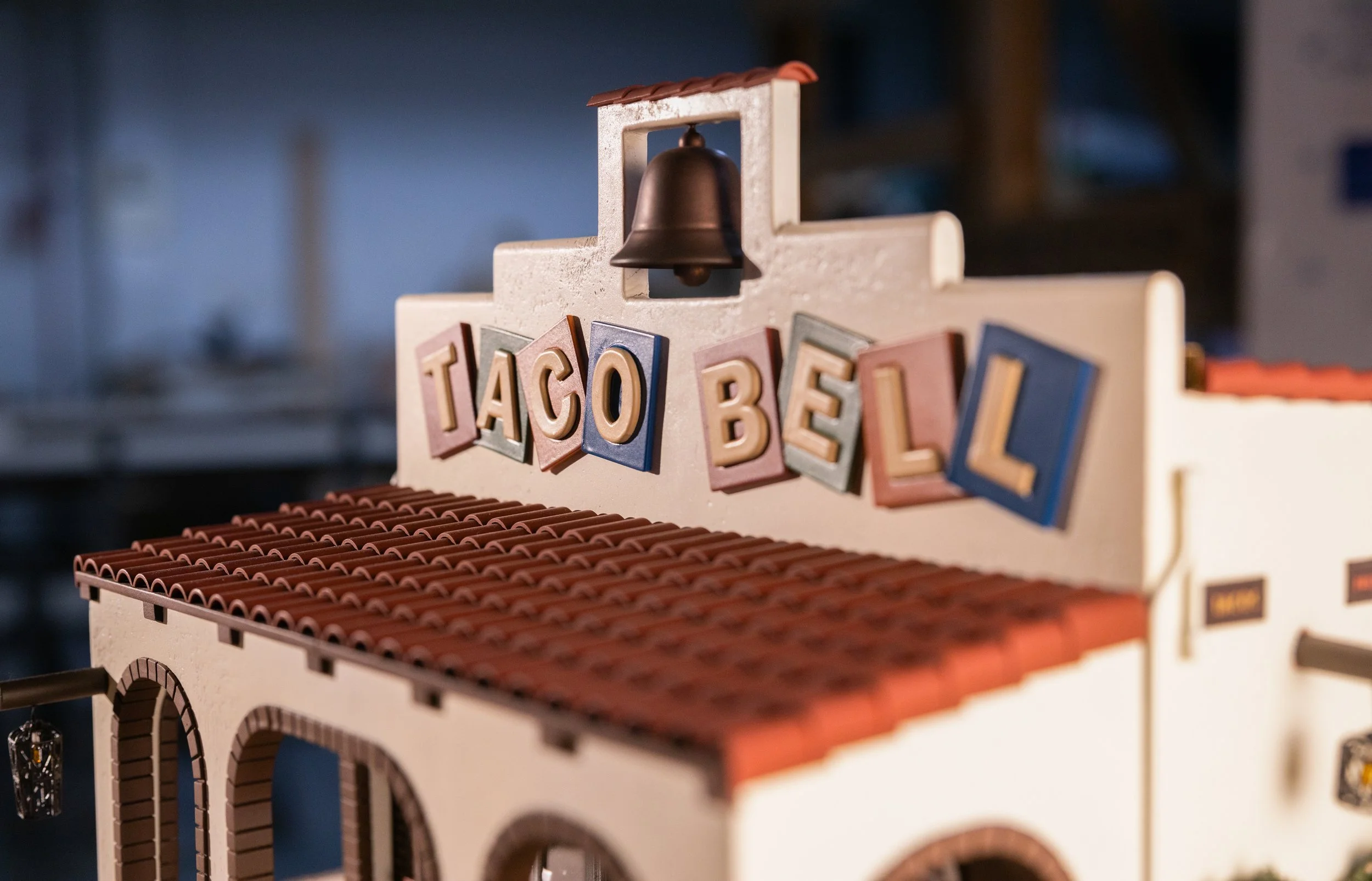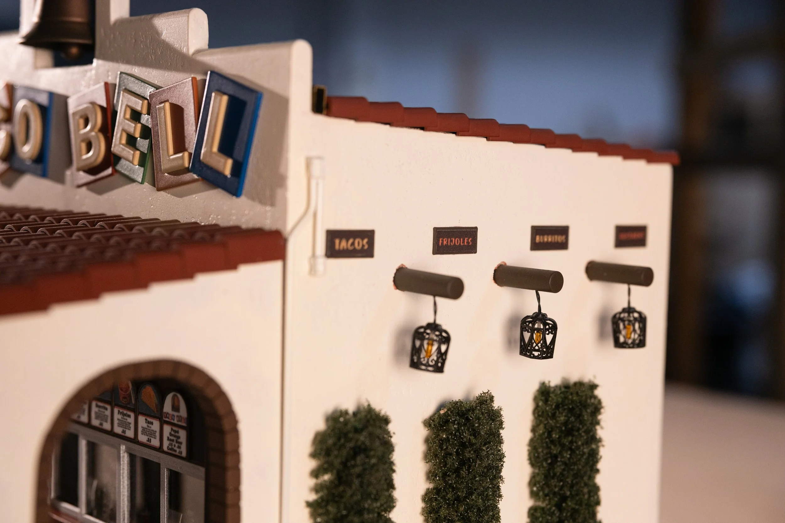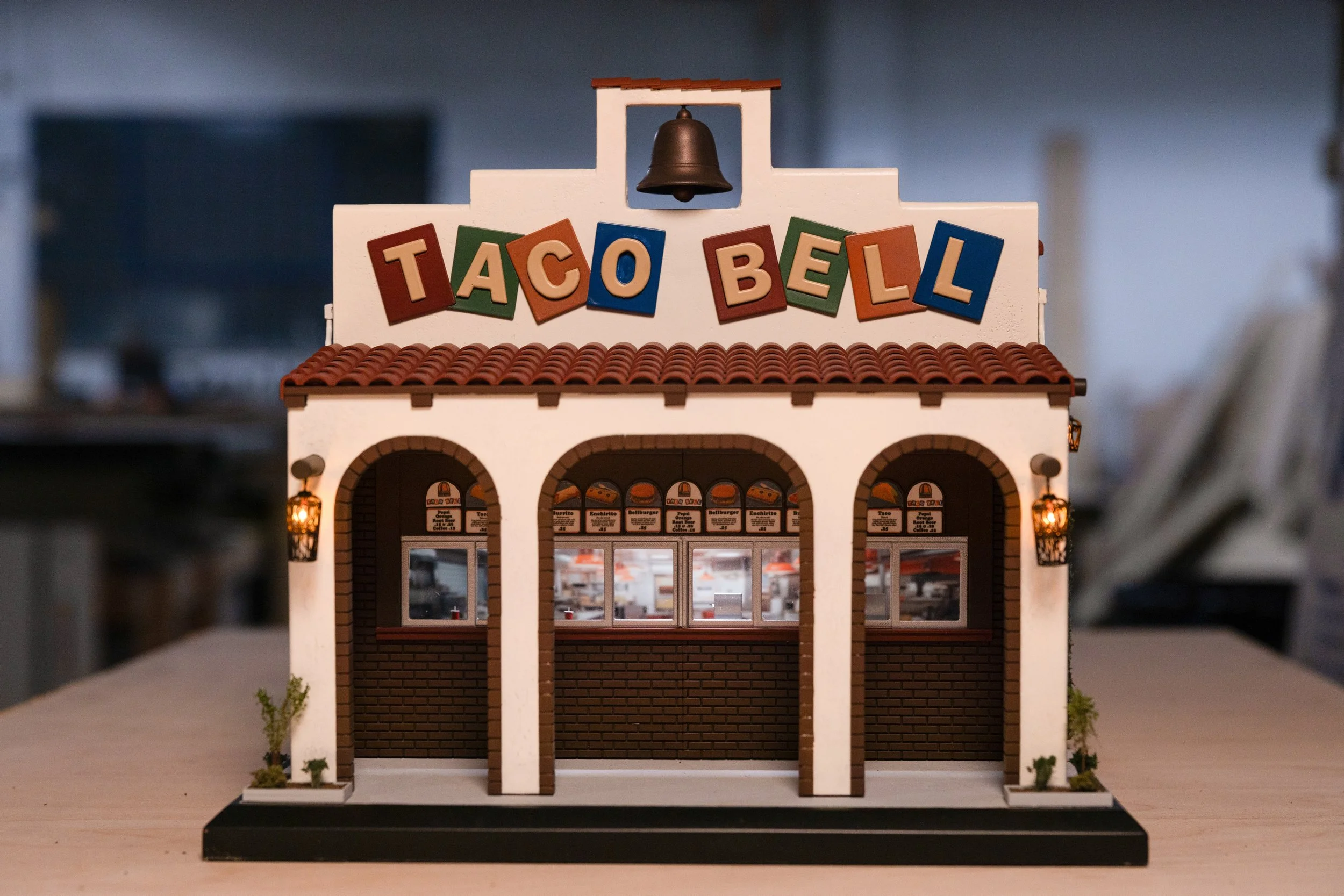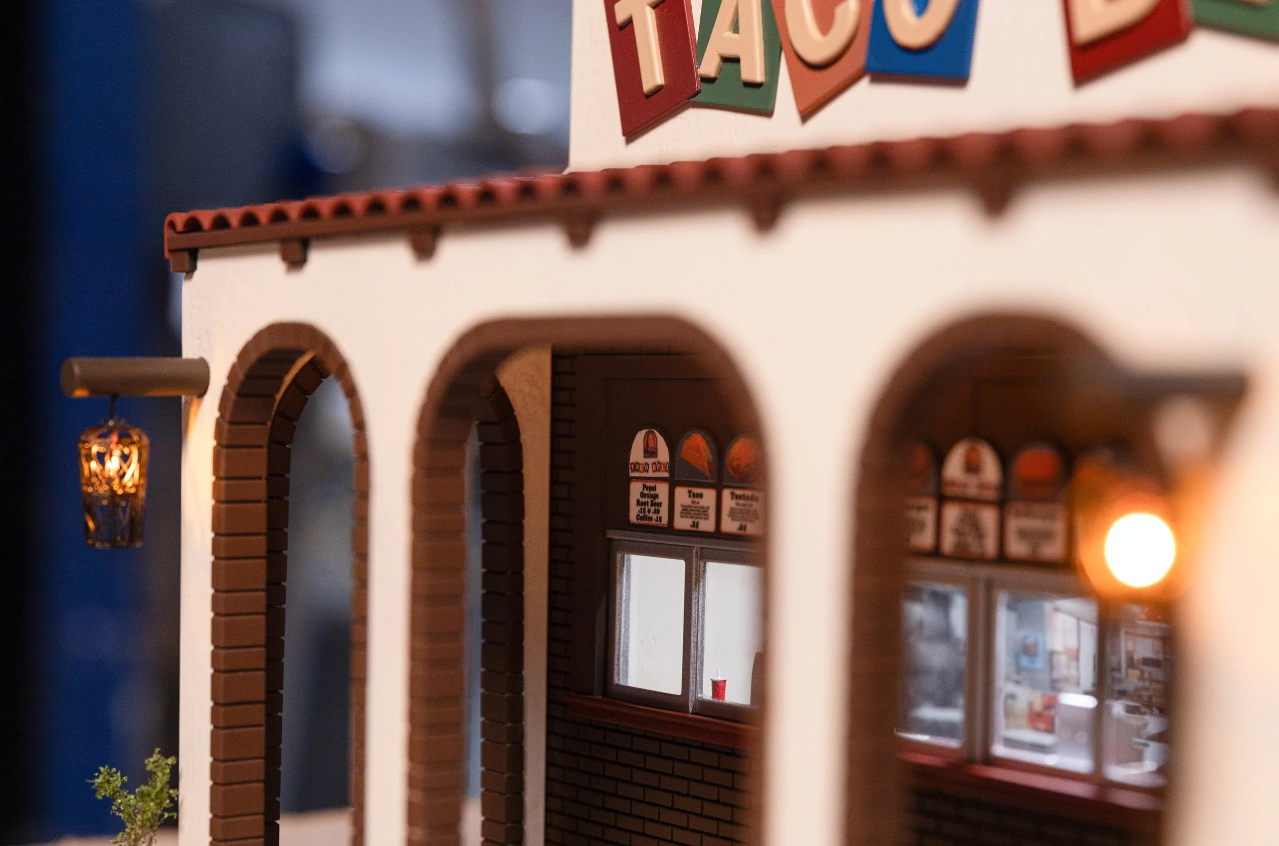 Taco Bell miniature model fabrication with Cyrano Rox. Built from limited photo reference using 3D modeling and scratch-built techniques, basswood structure with stucco stipple texture, resin-printed sign for crisp details, scale landscaping, custom electronics and lighting, and detailed interior menus and graphics.