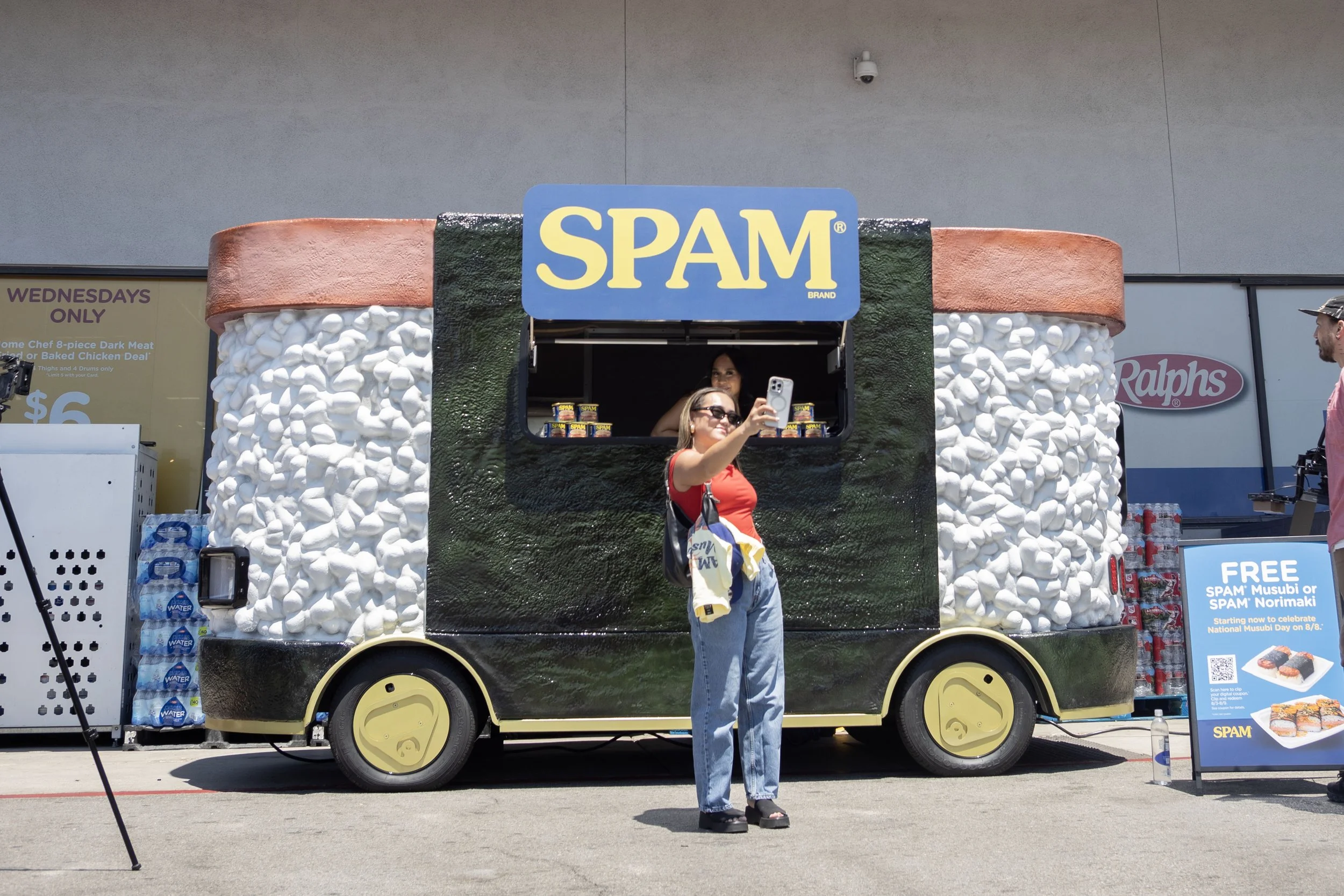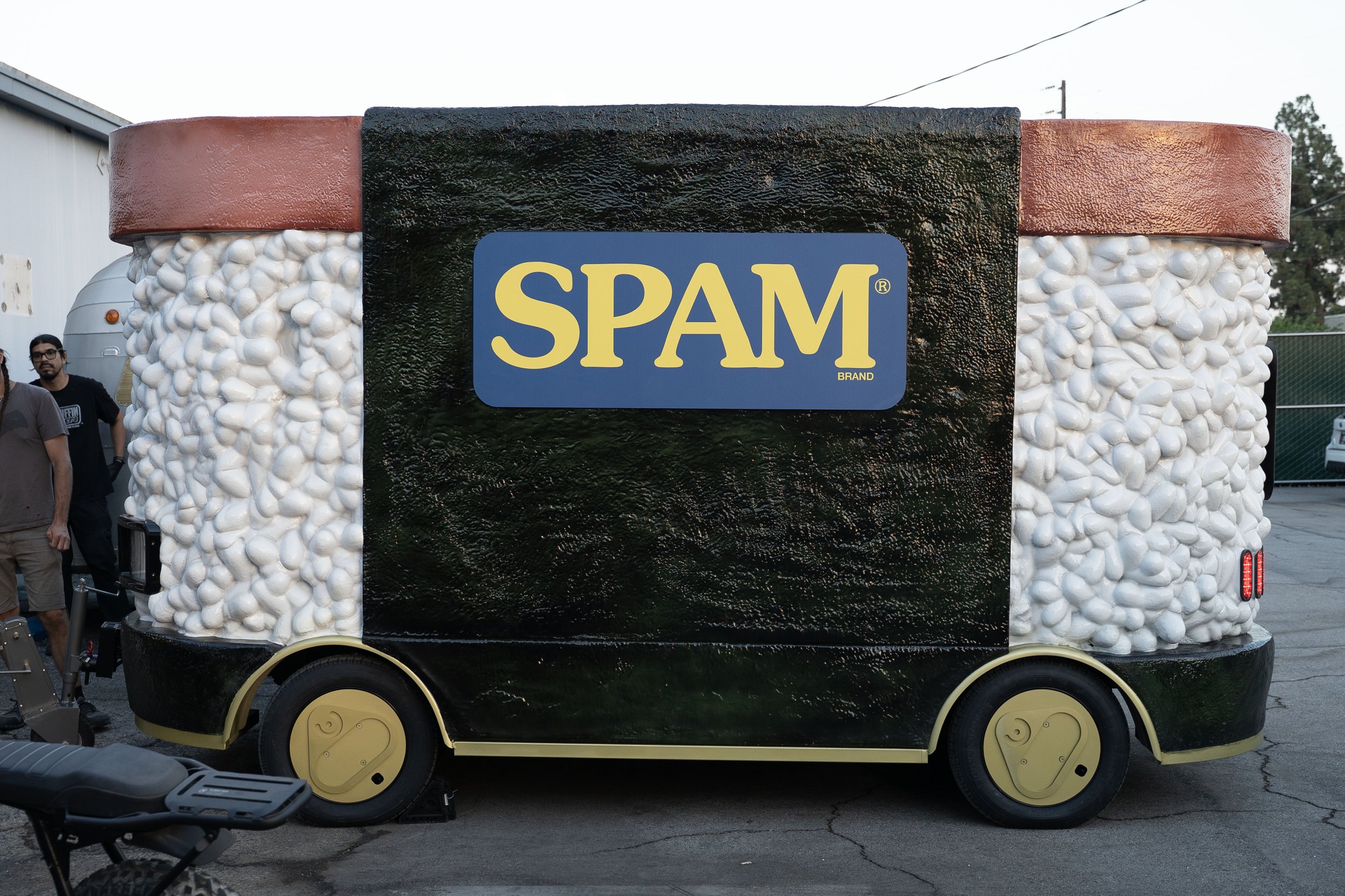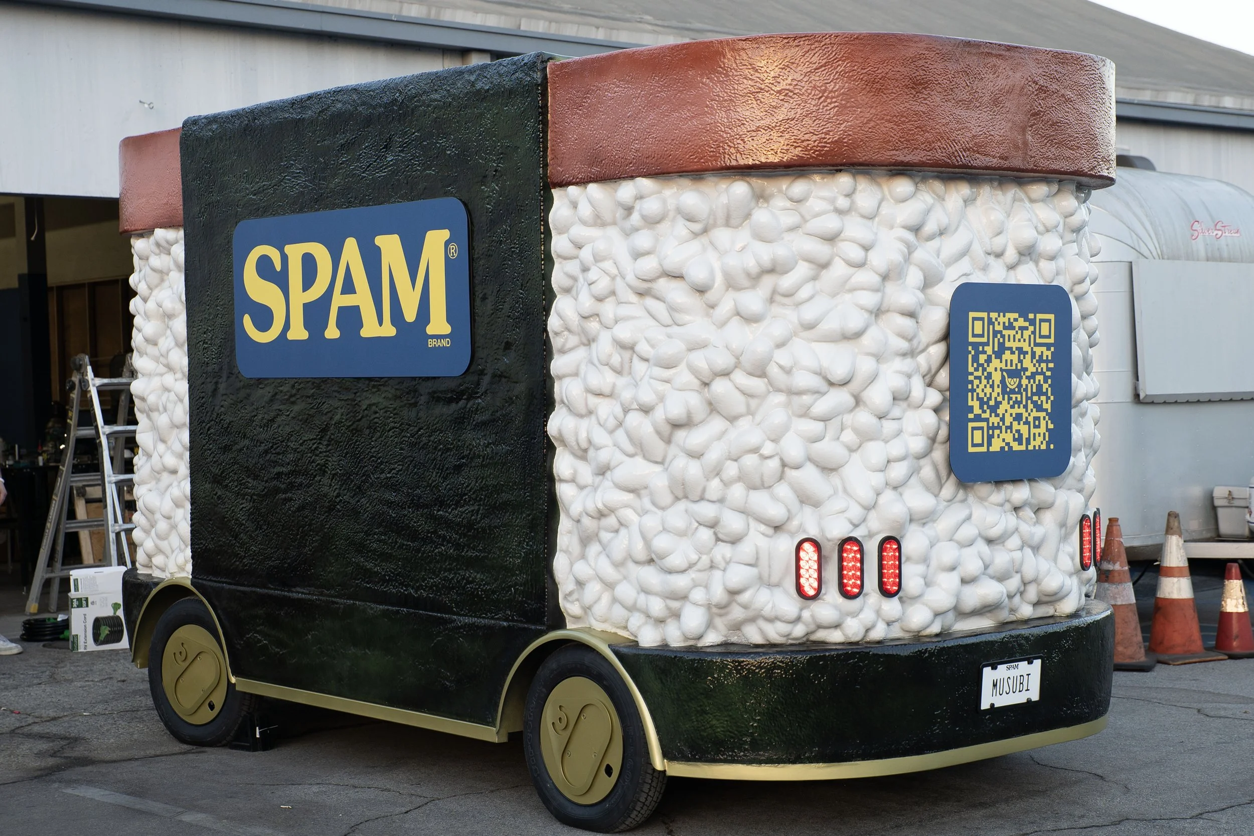 Mobile SPAM Musubi activation vehicle fabrication. Hard coated foam sculpt over a scratch-built frame and chassis with stainless-clad interior, warmer, refrigerator, storage, lighting, suspension, steering, and working lights. Automotive paint and clear coat durability with a vertical lift serving window hinge system to keep branding visible.
