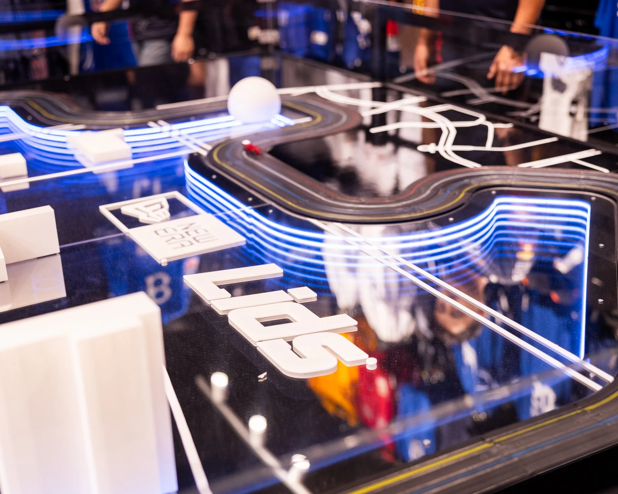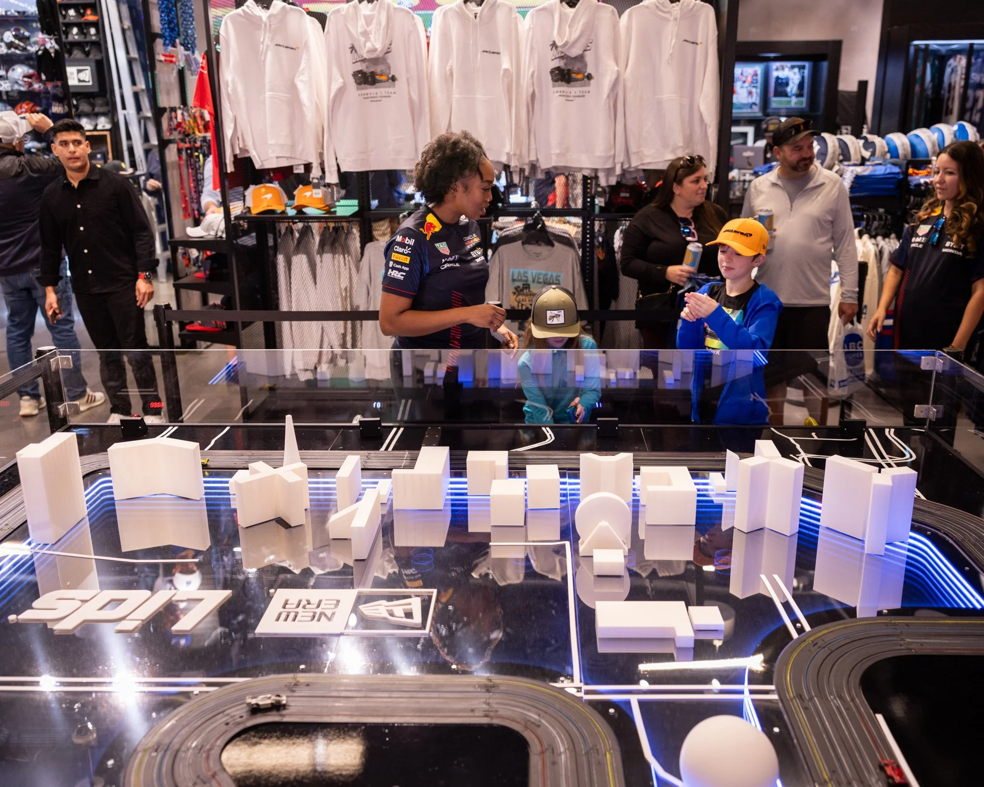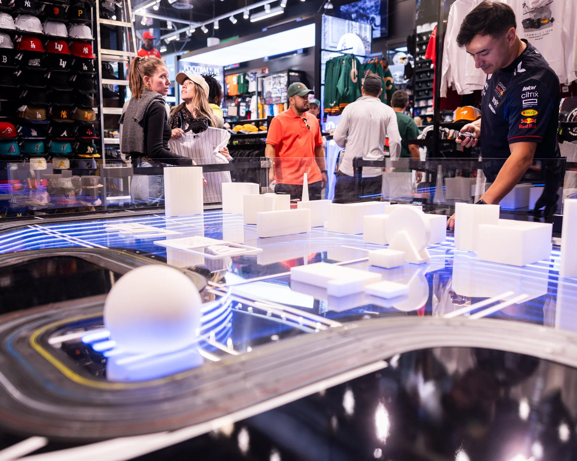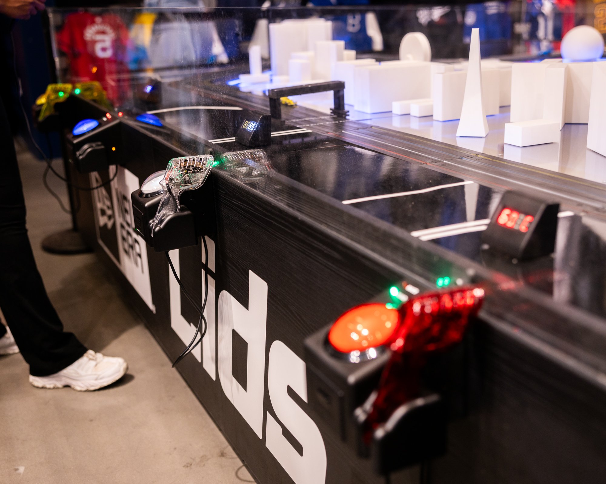 Interactive HO scale slot car track for Lids Las Vegas Flagship during F1 Vegas Grand Prix 2023 and 2024. Modified hobby slot car kits, infinity mirror infield, low-poly Vegas icons, timed gameplay with player stations, infrared sensors, lap-time display, printed receipts, acrylic perimeter guard, custom cabinet and controller boxes, and custom modeled F1 bodies for HO chassis.