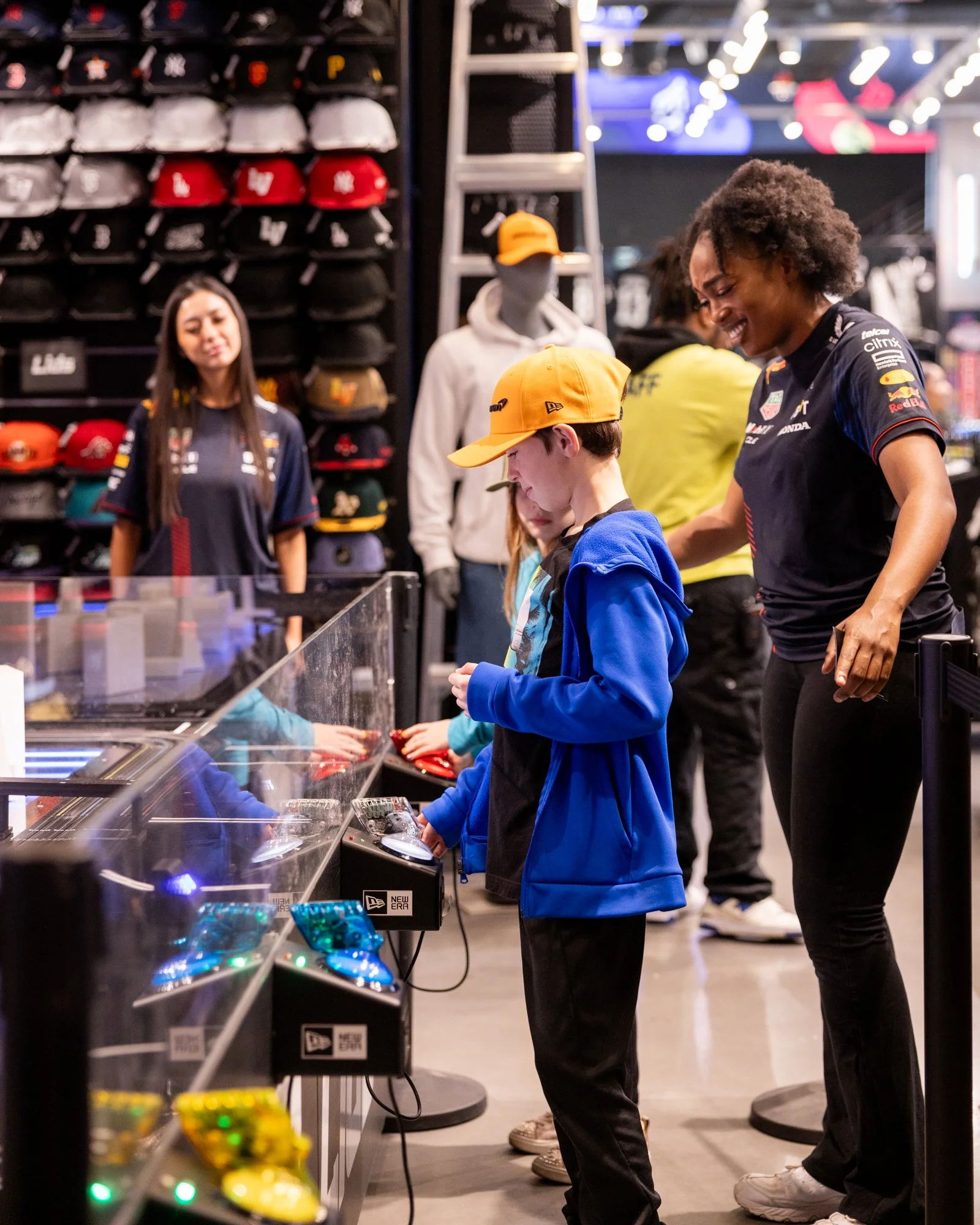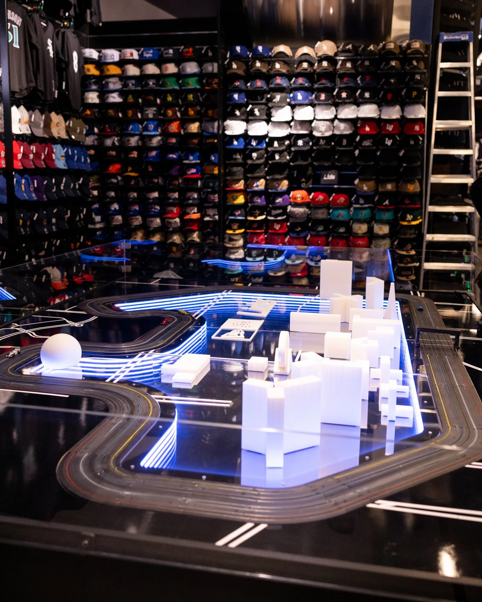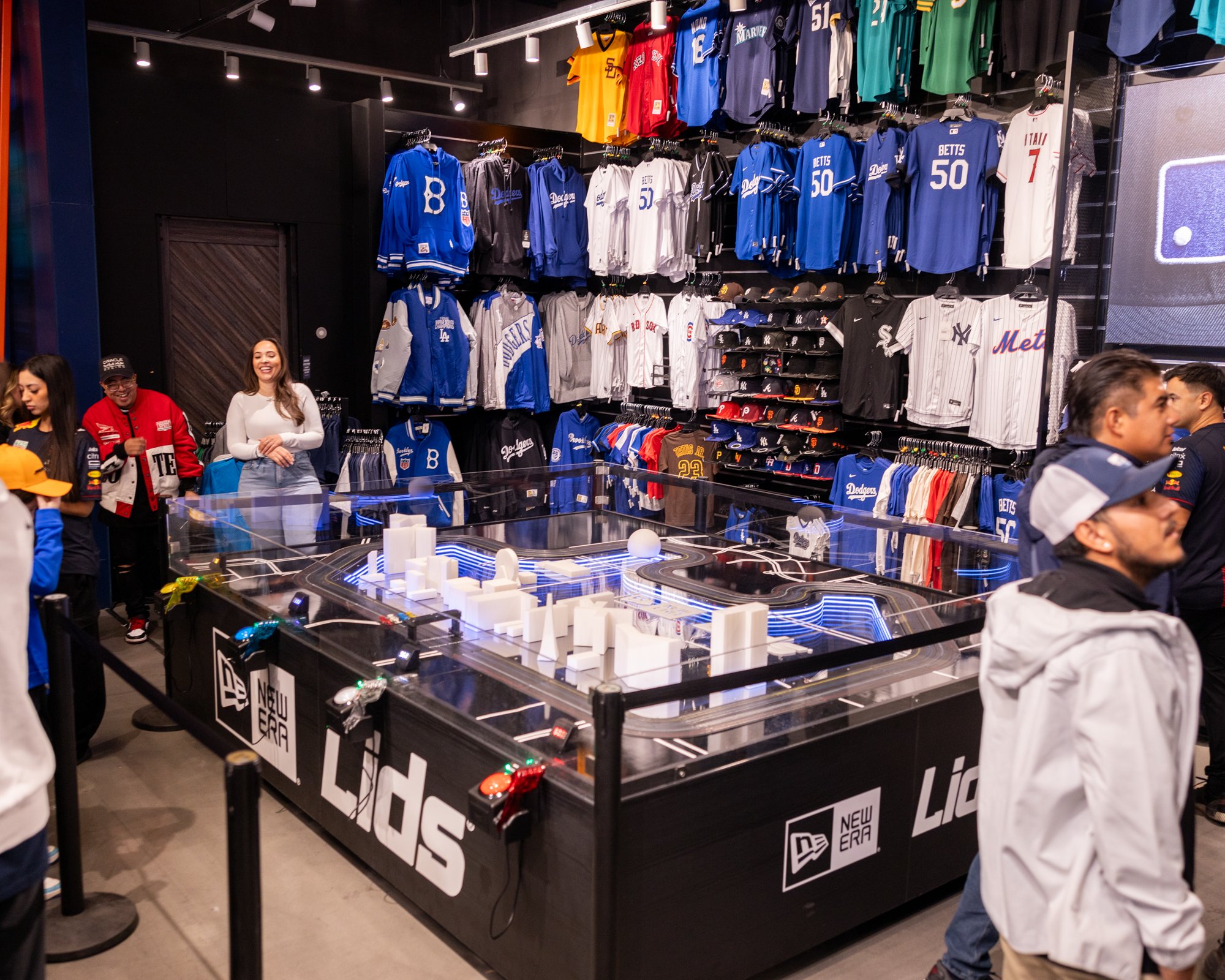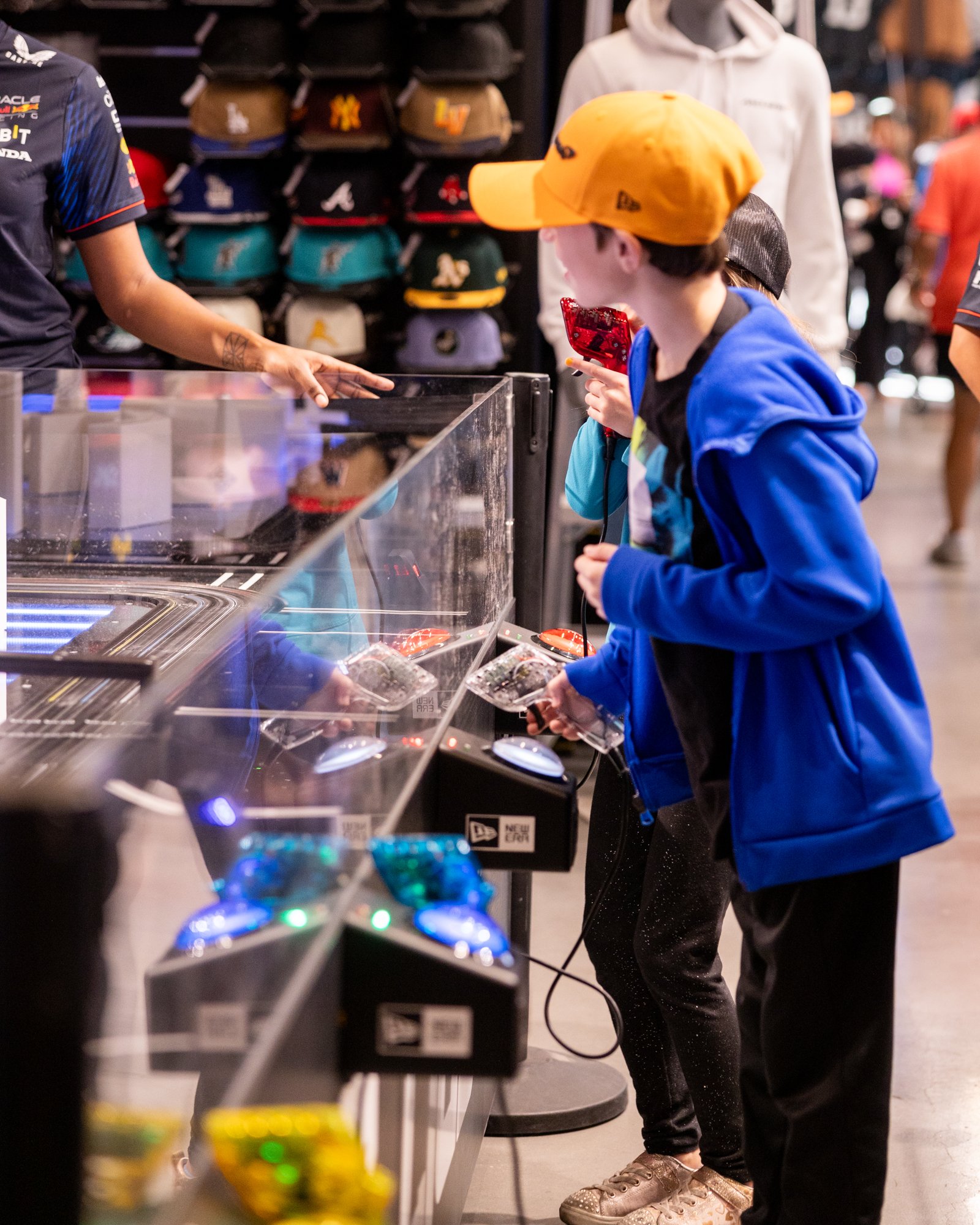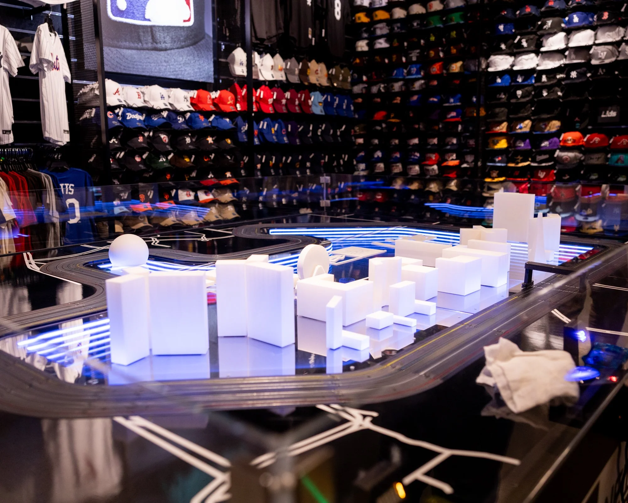 Interactive HO scale slot car track for Lids Las Vegas Flagship during F1 Vegas Grand Prix 2023 and 2024. Modified hobby slot car kits, infinity mirror infield, low-poly Vegas icons, timed gameplay with player stations, infrared sensors, lap-time display, printed receipts, acrylic perimeter guard, custom cabinet and controller boxes, and custom modeled F1 bodies for HO chassis.