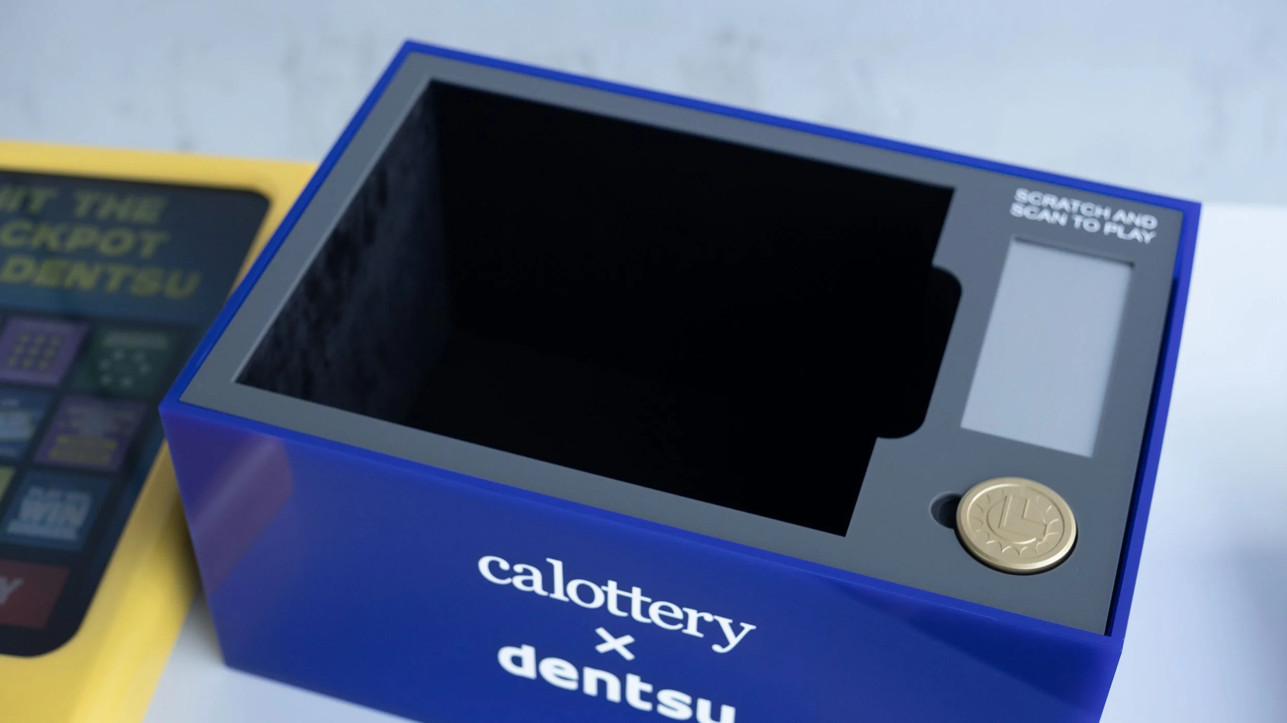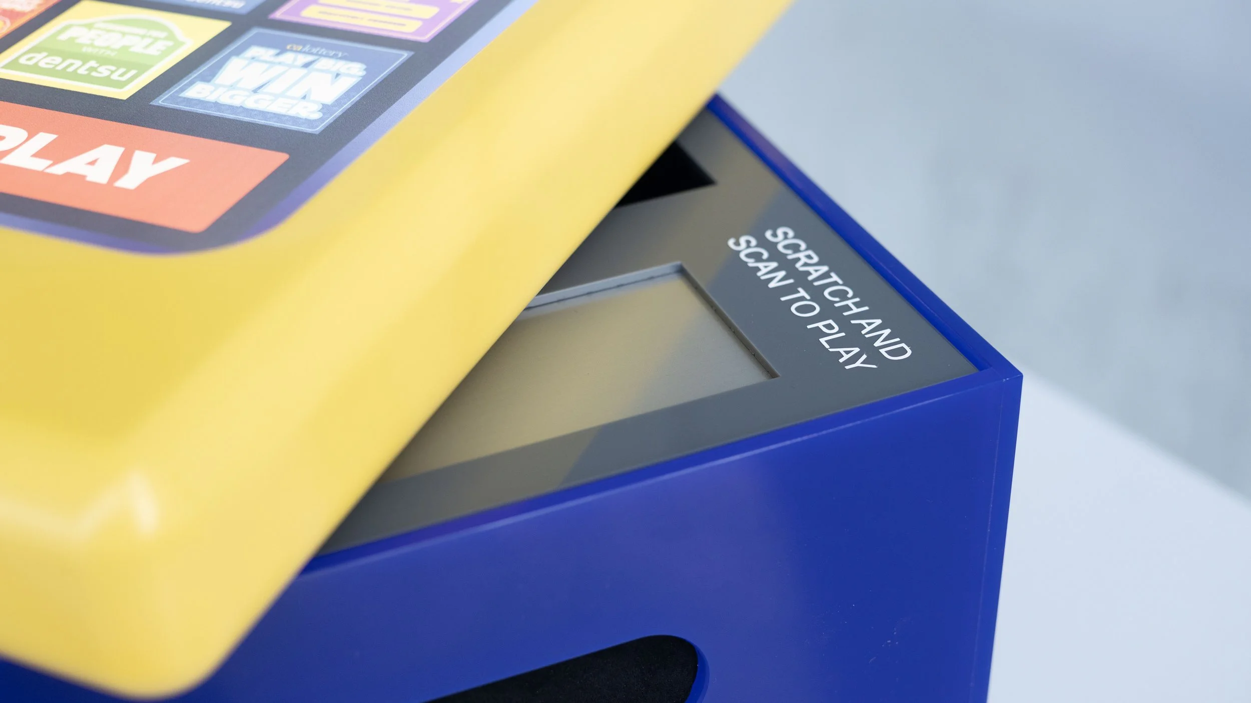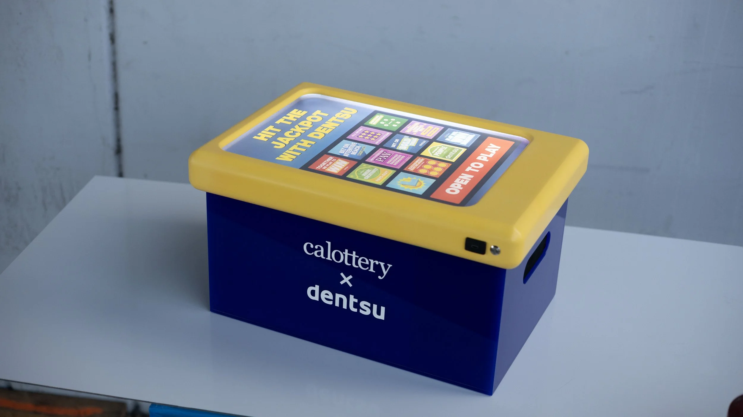California Lottery interactive pitch box with dentsu creative. Backlit screen lid inspired by Calottery kiosks, battery-powered wall art, 3D printed lid components, polished acrylic base, scratch-off reveal area with QR code, and felt-lined cavity for presentation books.