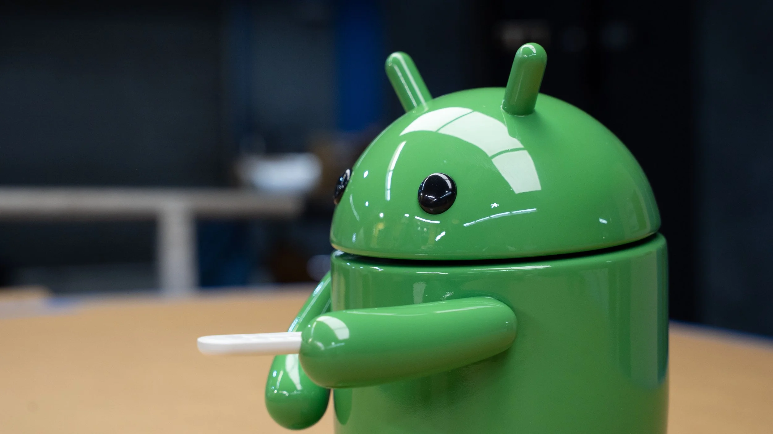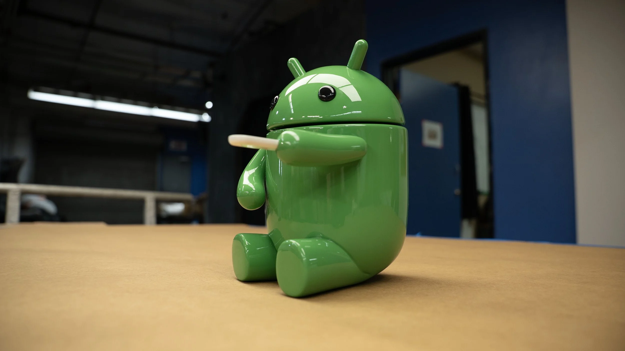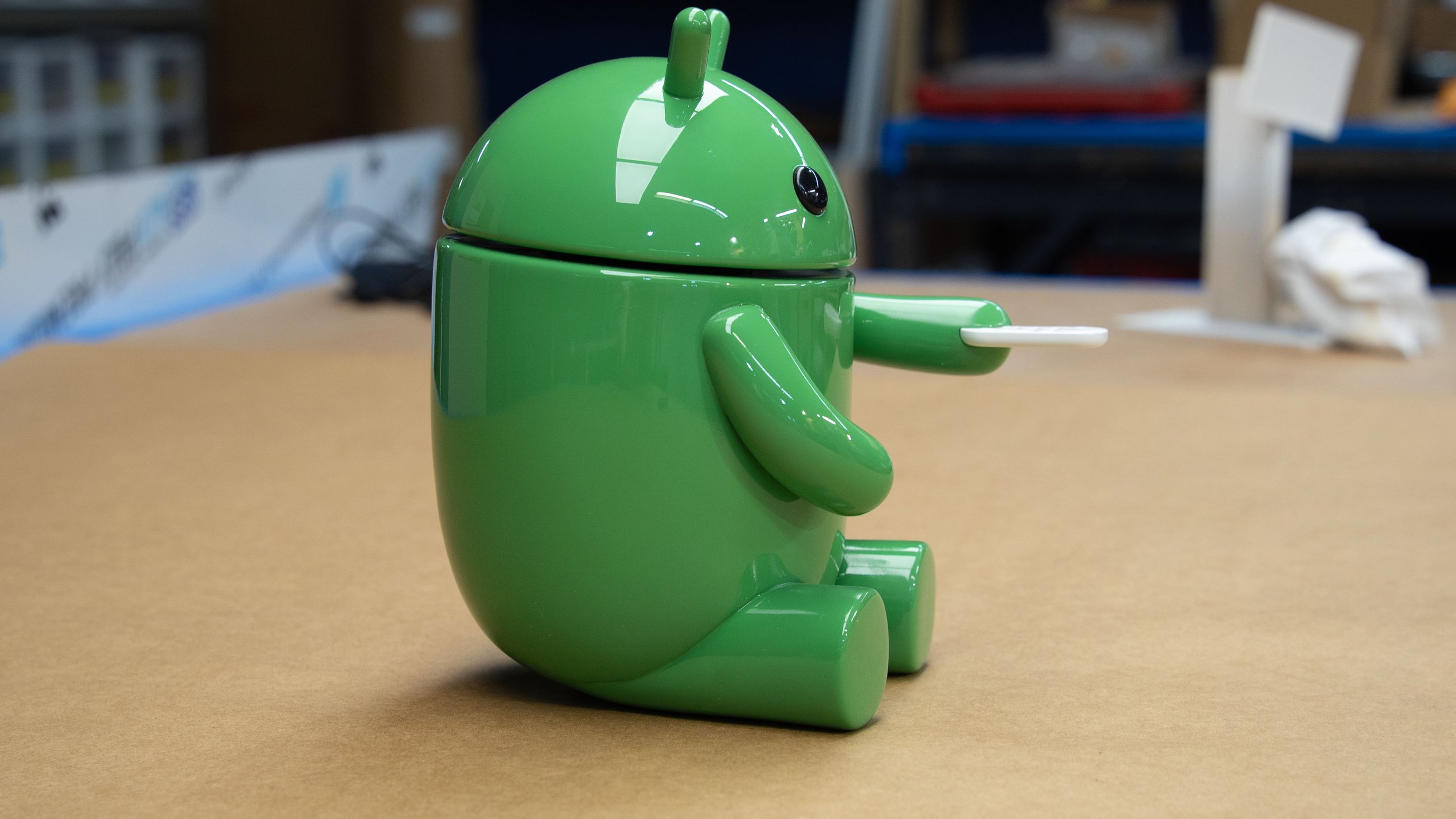 Google HQ lobby display android bot model. Ten-inch scale figure in a shadow box near Google TV. Resin 3D printed parts with museum-quality body shop finishing, automotive paint matched to Google Pantone colors, and polished clear coat.