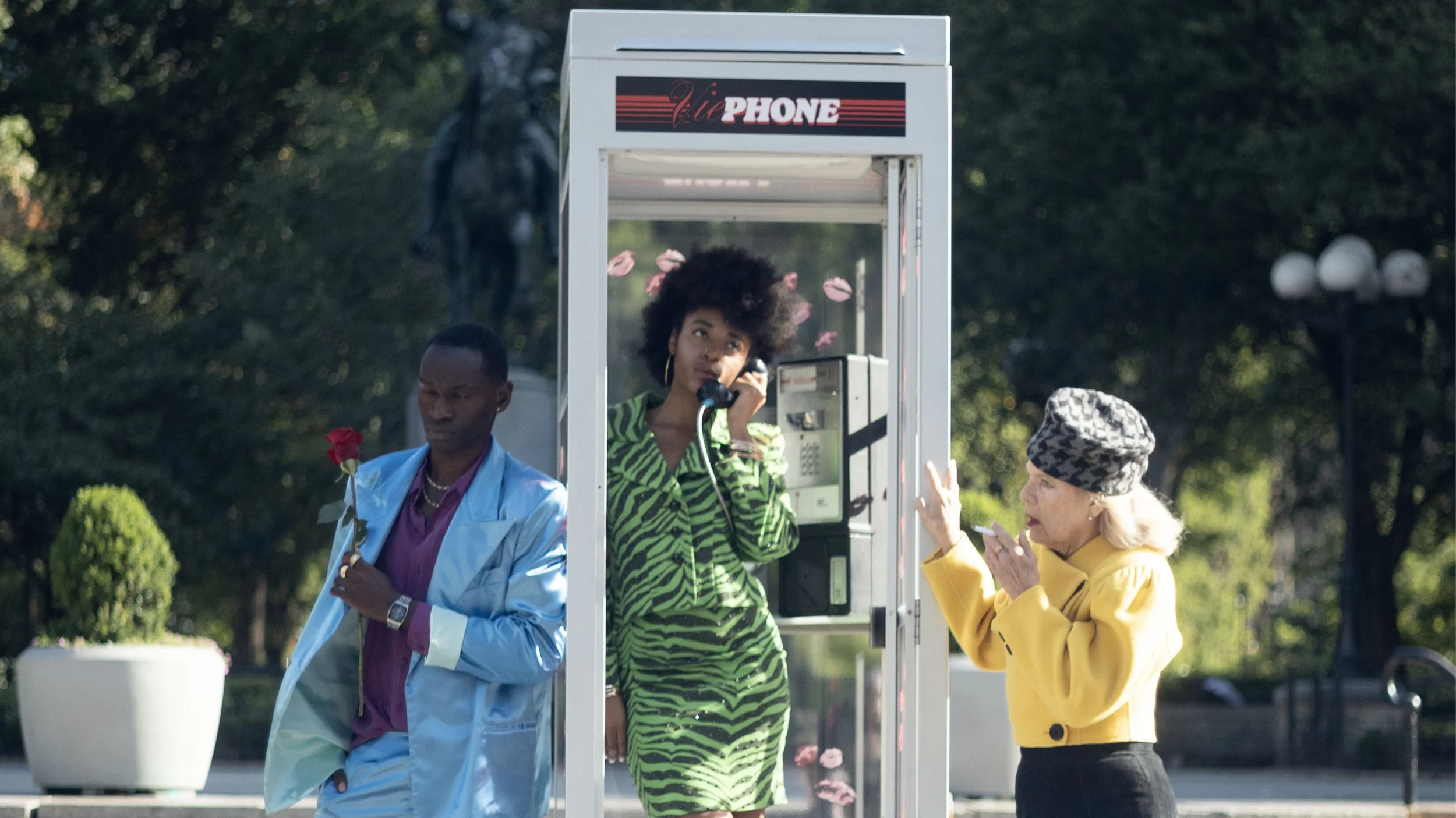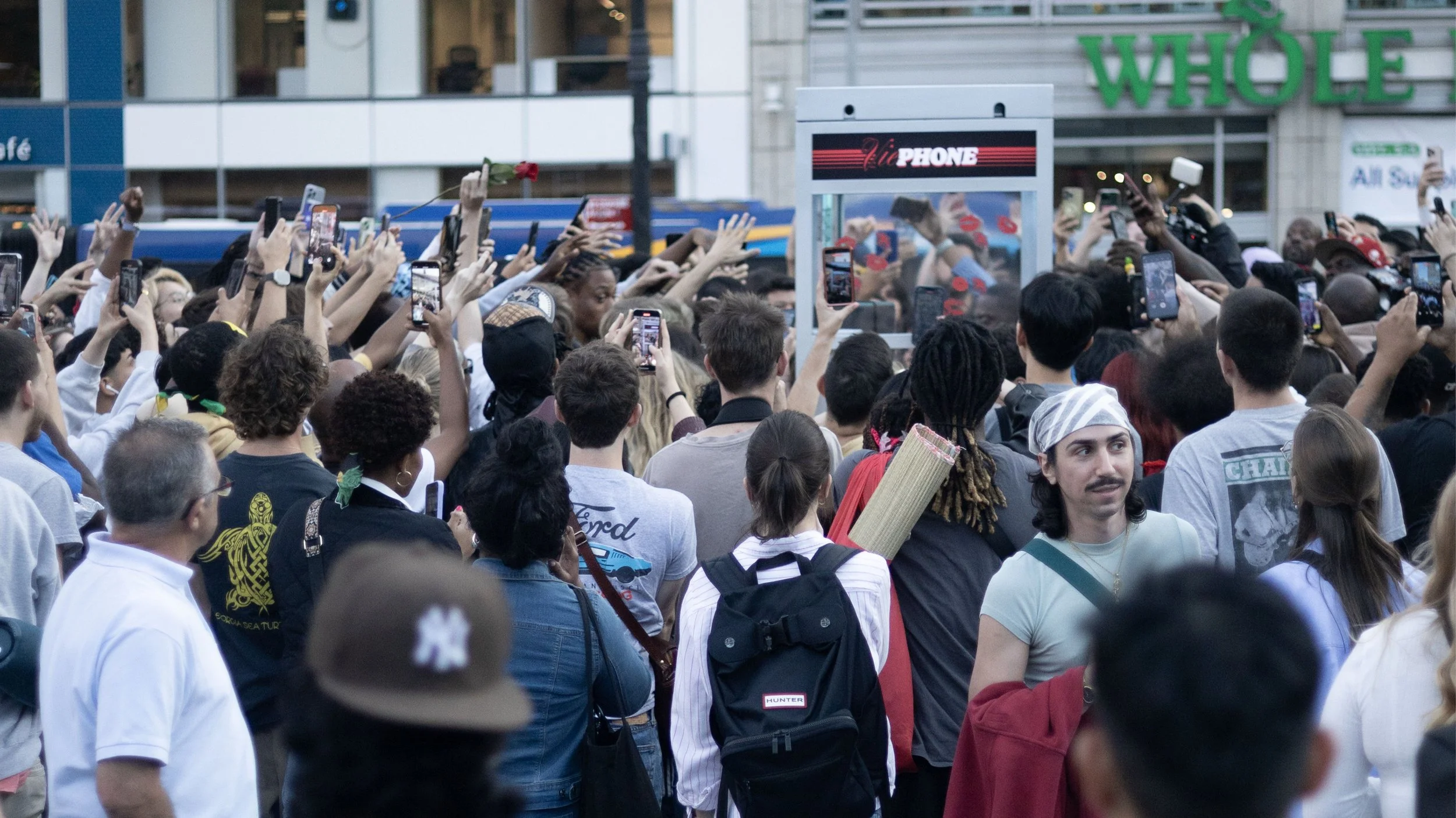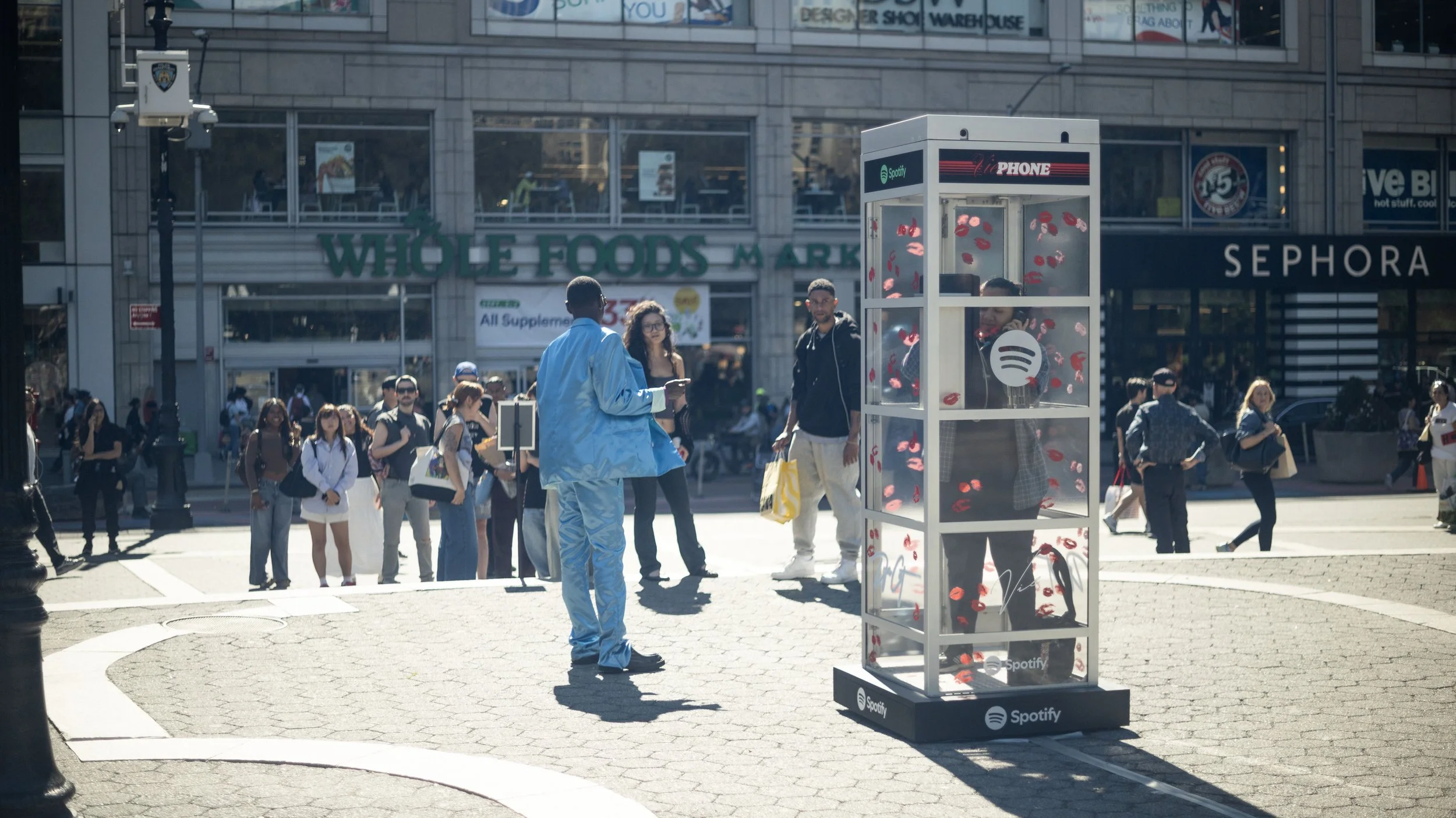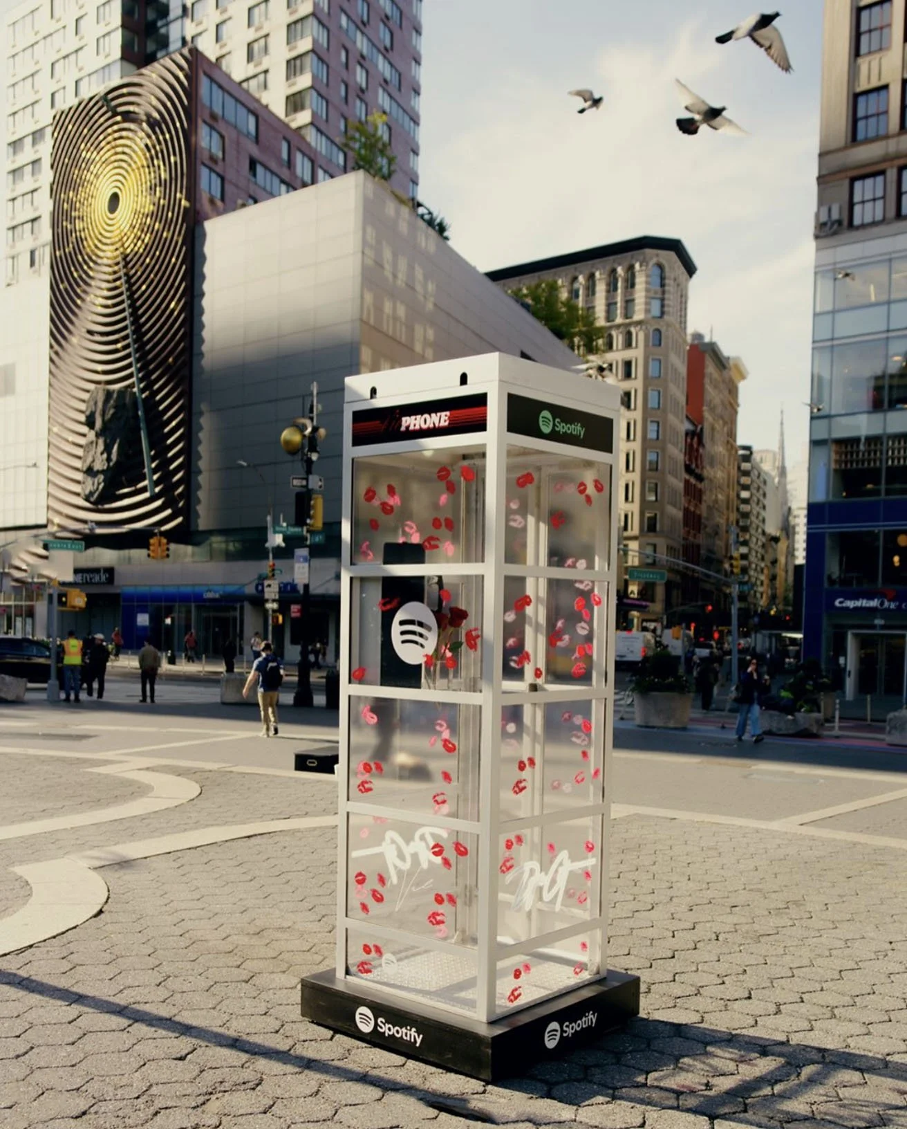 Doja Cat album release phone booth activations in New York and Los Angeles. Restored salvaged phone booths with custom electronics in original payphones for high-fidelity audio playback, colored LED interior lighting, vinyl graphics, battery backup power, and period actors to encourage public interaction. Surprise Doja Cat visit at Washington Square activation.