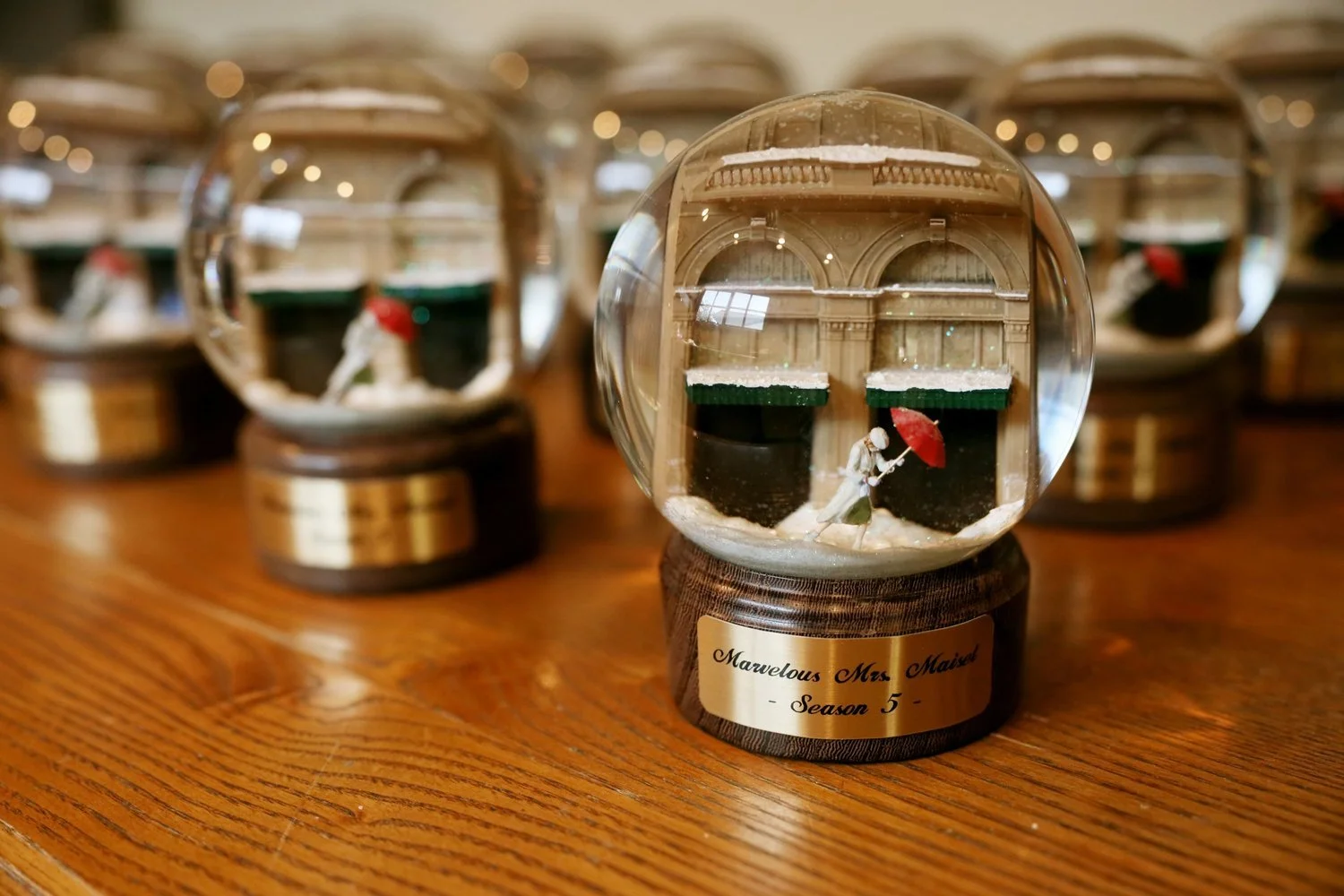 The Marvelous Mrs. Maisel wrap gifts: custom snow globes featuring the show logo and Carnegie Hall scene for final season crew. Glass globes paired with hand-turned walnut and wenge bases.